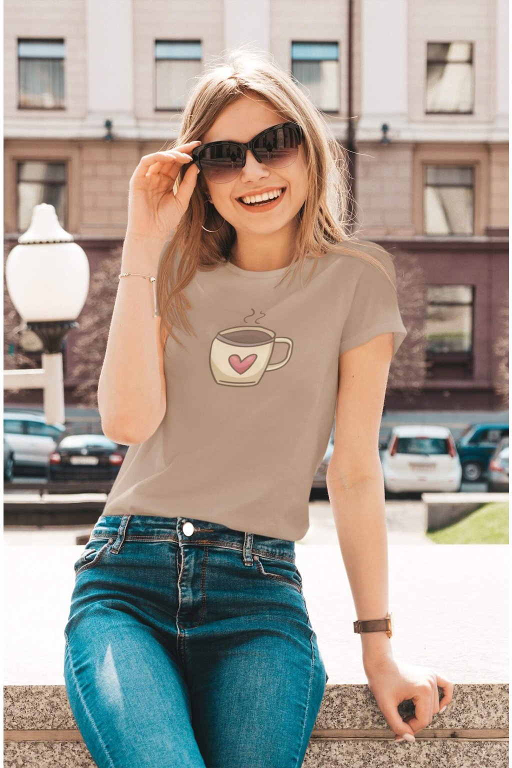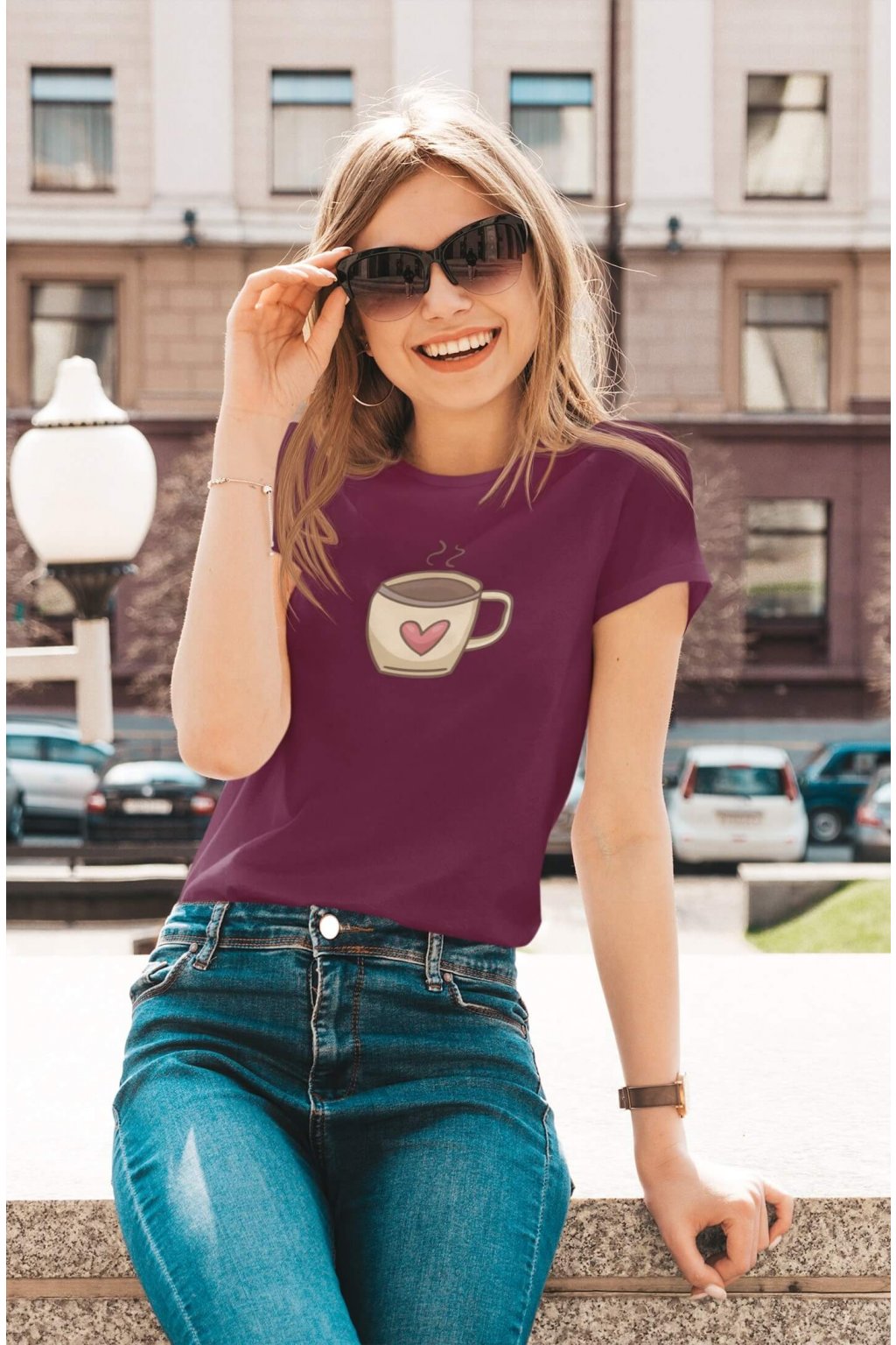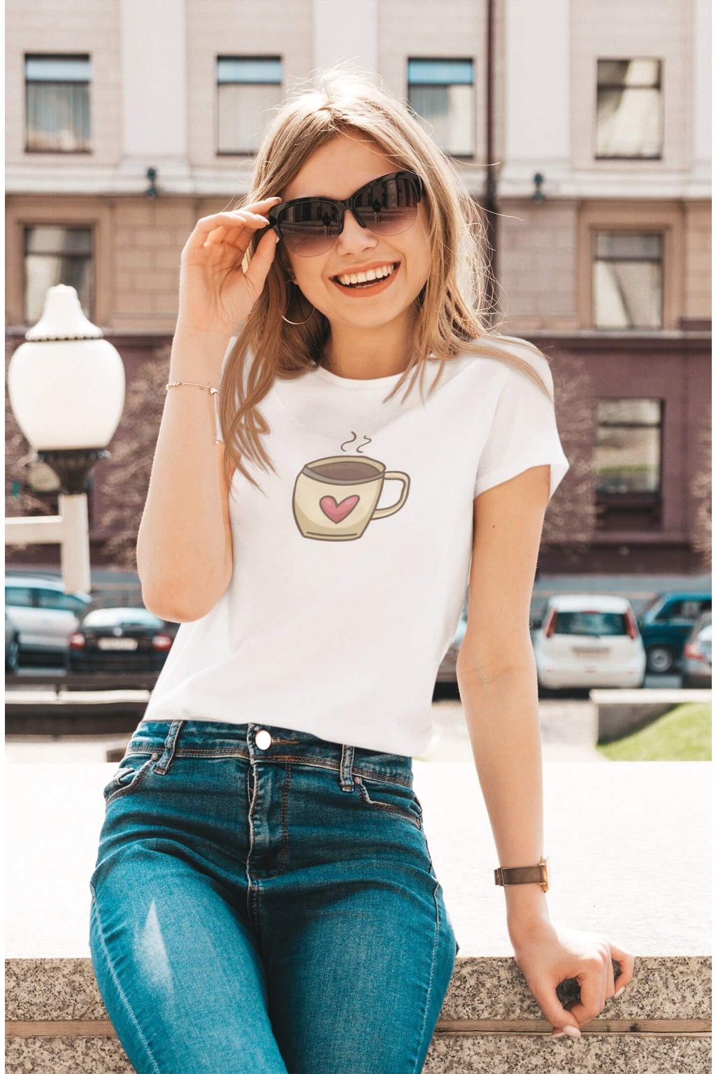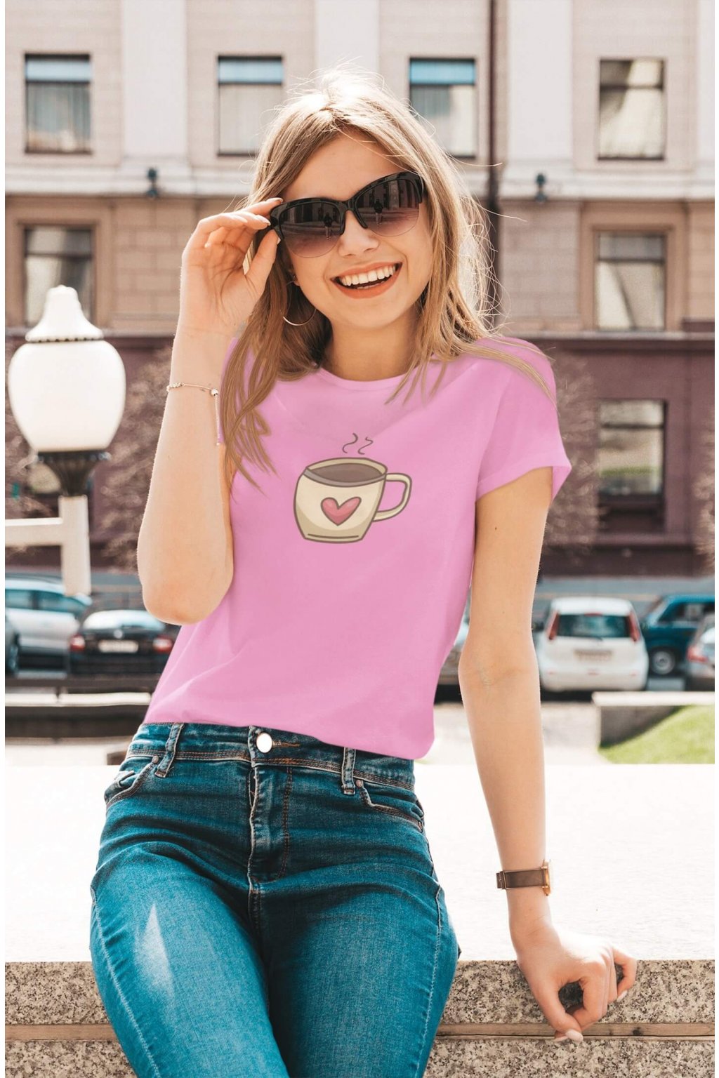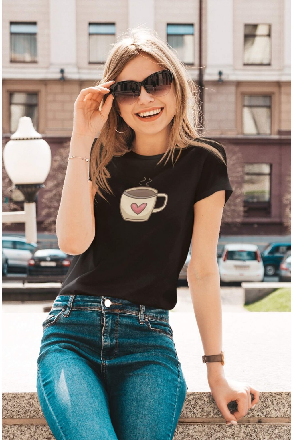Dámské bavlněné tričko s krátkým rukávem a motivem kávy. Na tričku je roztomilý obrázek šálku kávy se srdíčkem. Tričko je vhodné pro každou milovnici kávy.