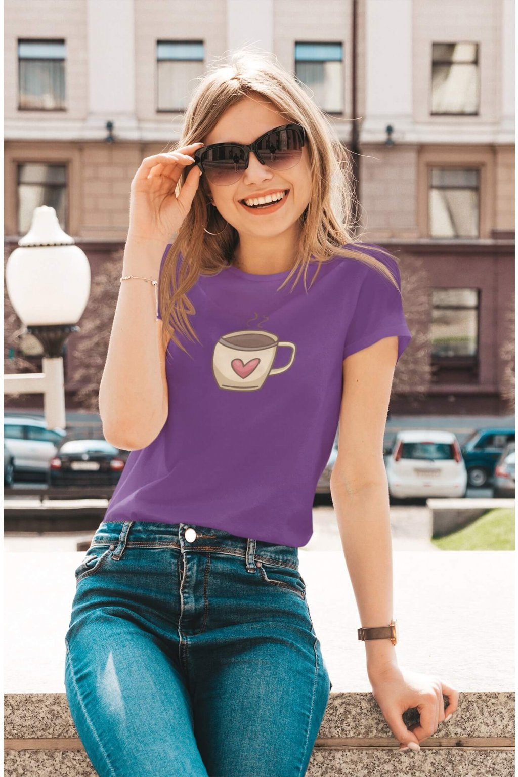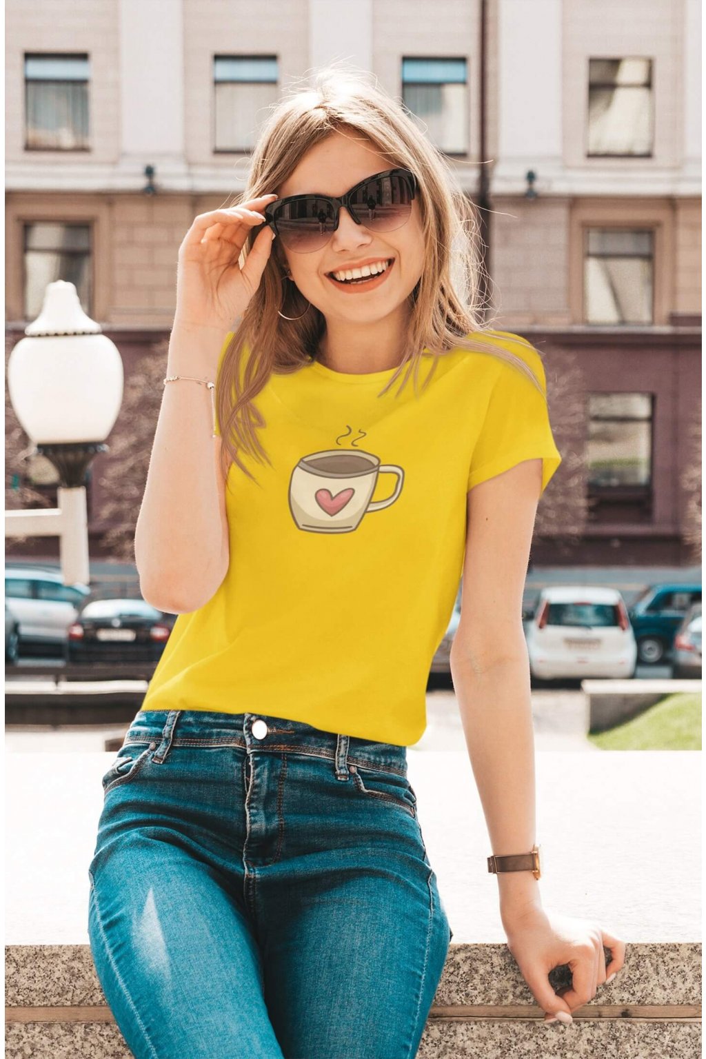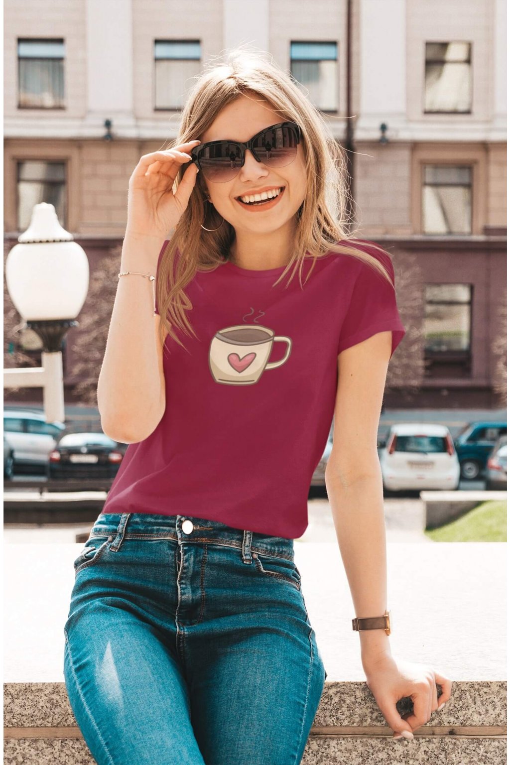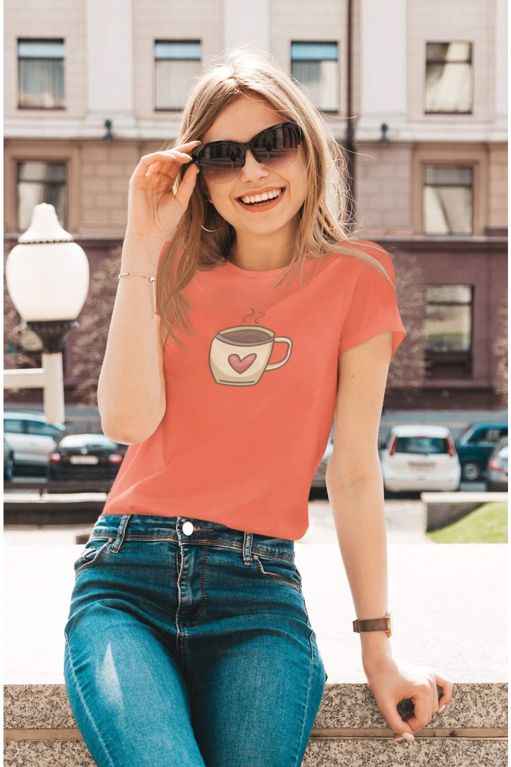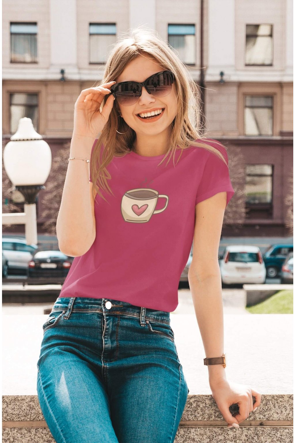 Dámské bavlněné tričko s krátkým rukávem a motivem kávy. Na tričku je roztomilý obrázek šálku kávy se srdíčkem. Tričko je vhodné pro každou milovnici kávy.