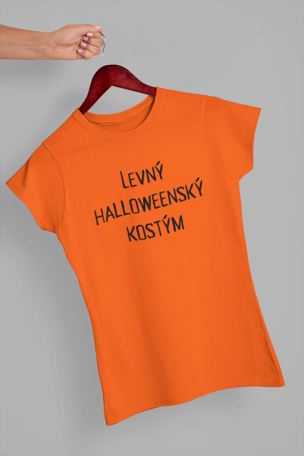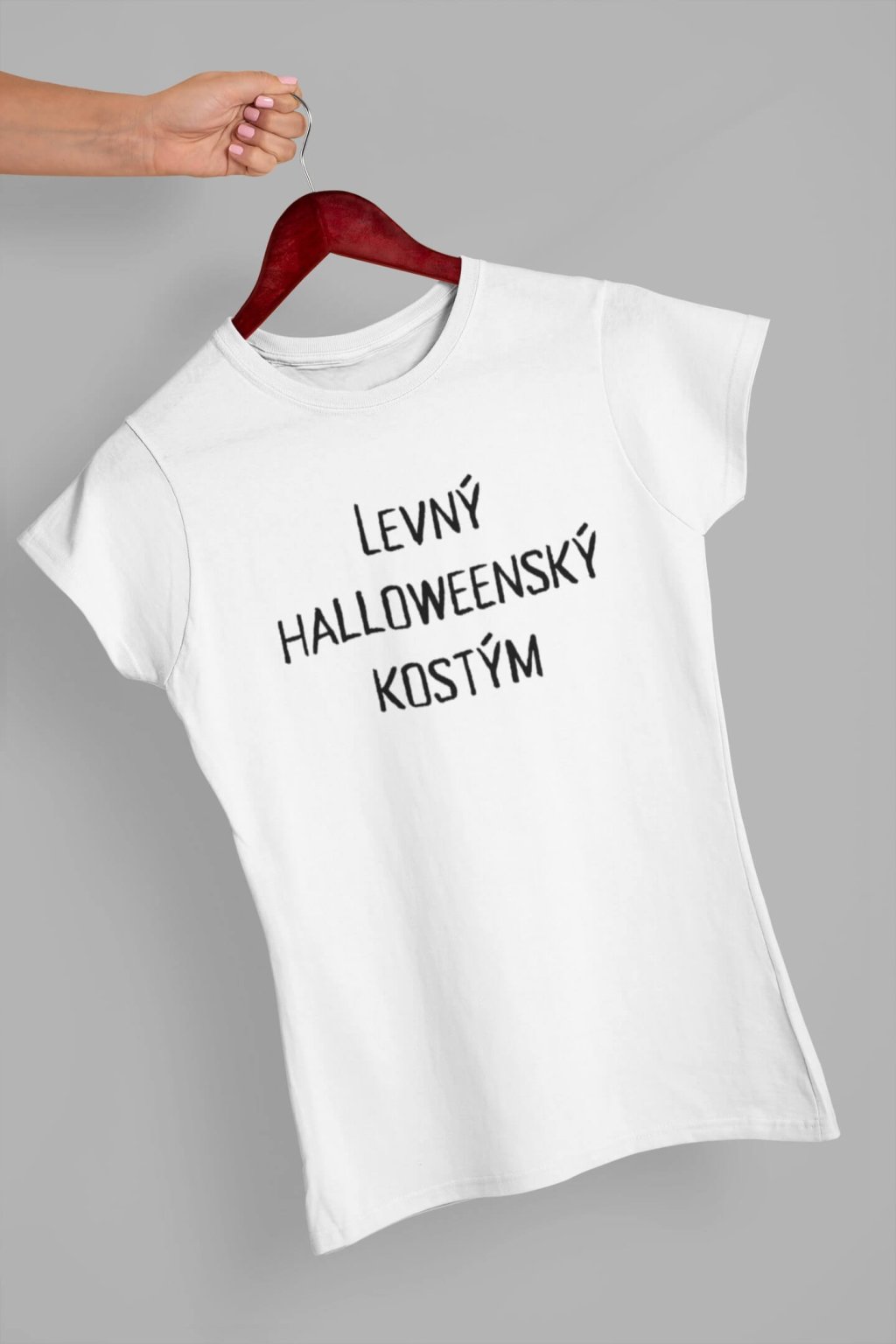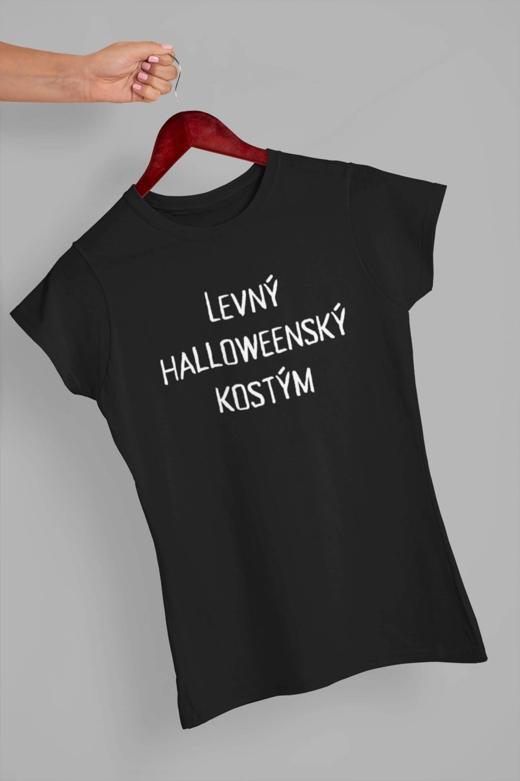 Dámské bavlněné triko s krátkým rukávem a vtipným potiskem. Na tričku je nápis "LEVNÝ HALLOWEENSKY KOSTÝM". Pokud si nechcete dělat starosti s kostýmem, toto triko je ideální pro Vás.
