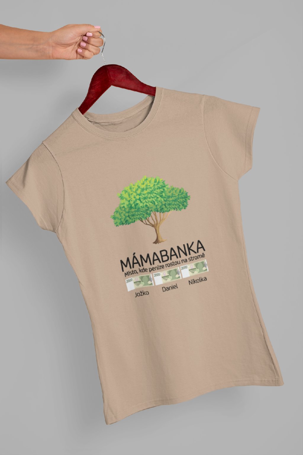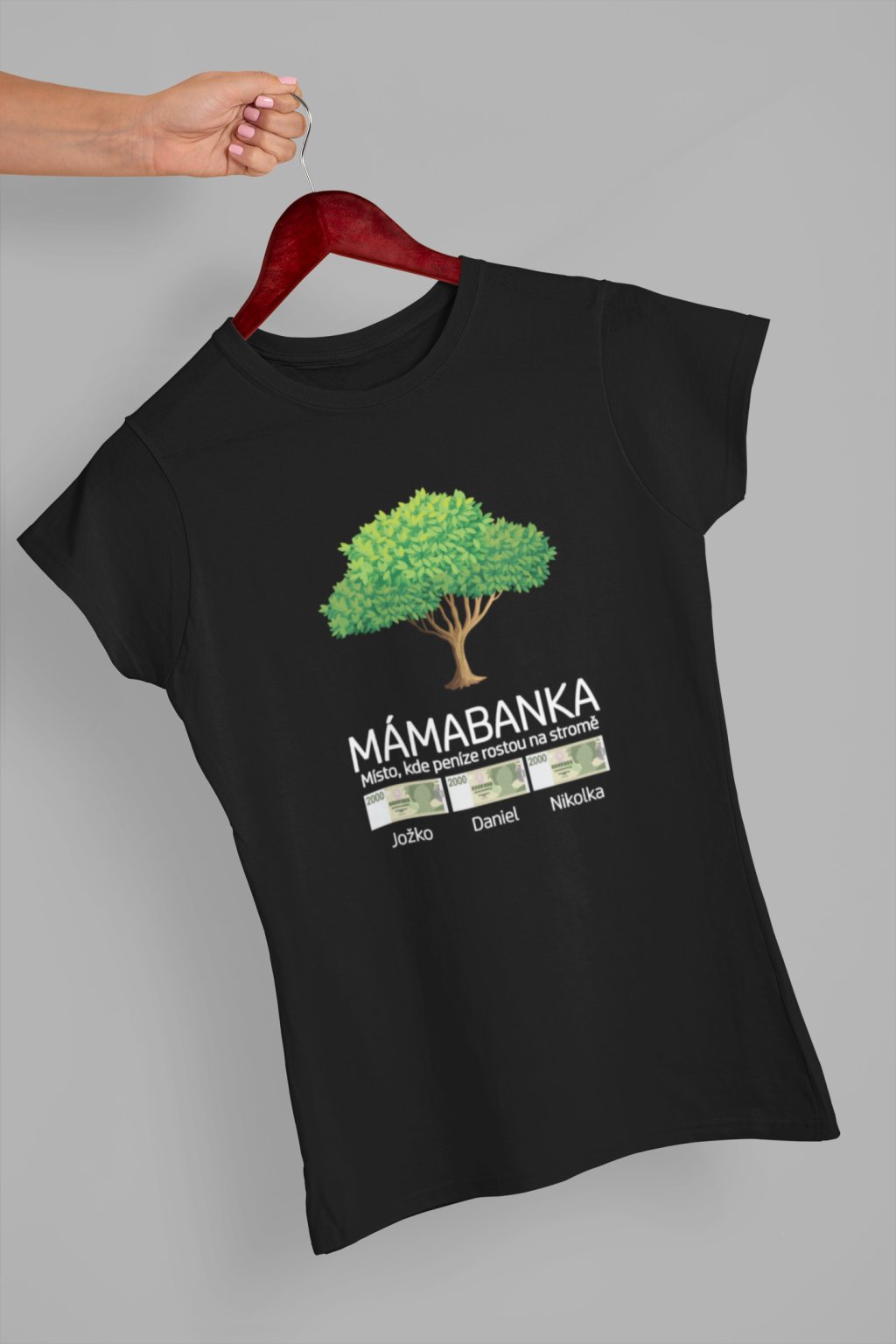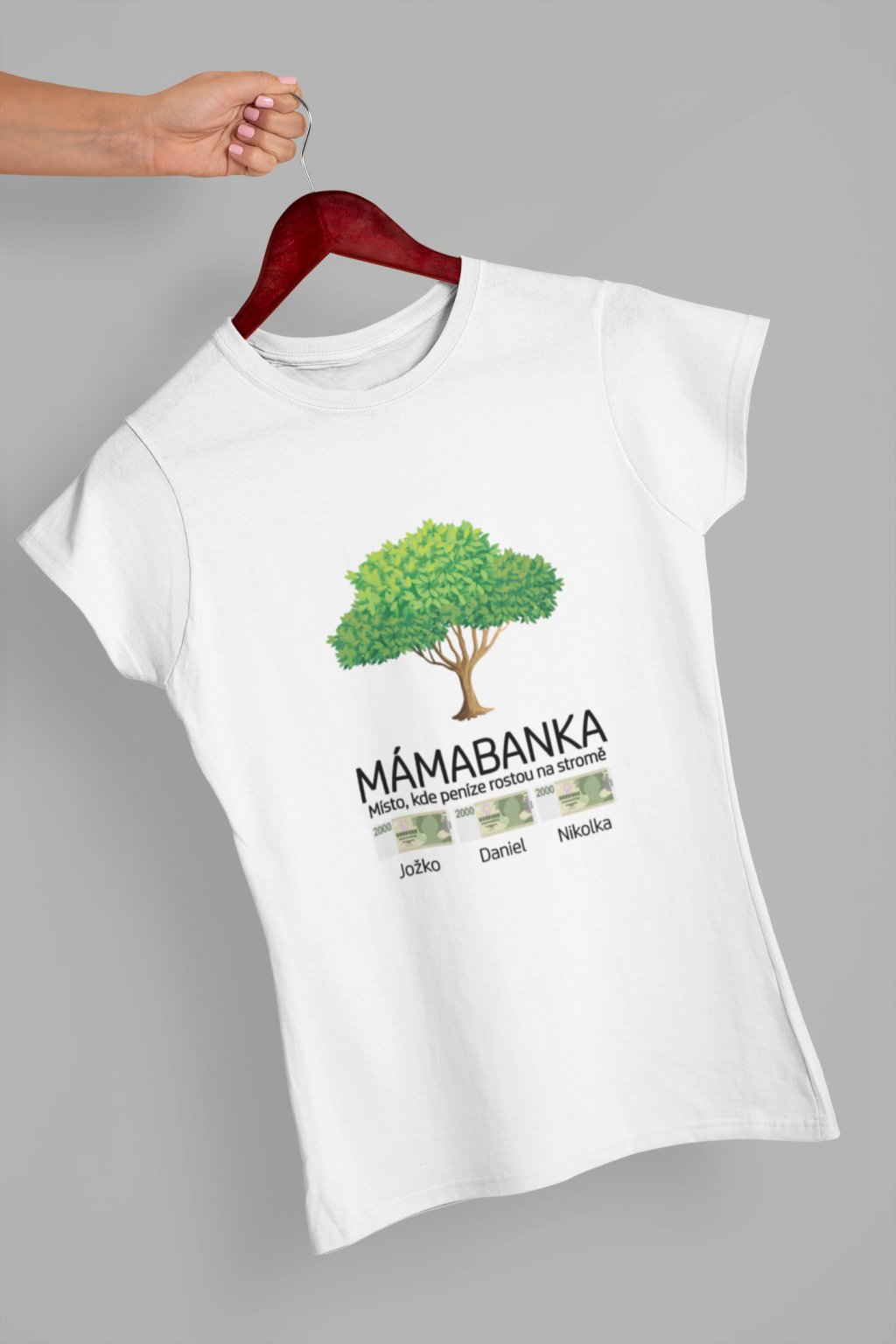 Dámské bavlněné triko s krátkým rukávem. Na tričku je nápis "Mámabanka". Pod nápisem je obrázek dětí spolu se jmény. Jména dětí si můžete doplnit podle sebe, stačí je jen napsat do poznámky k produktu.