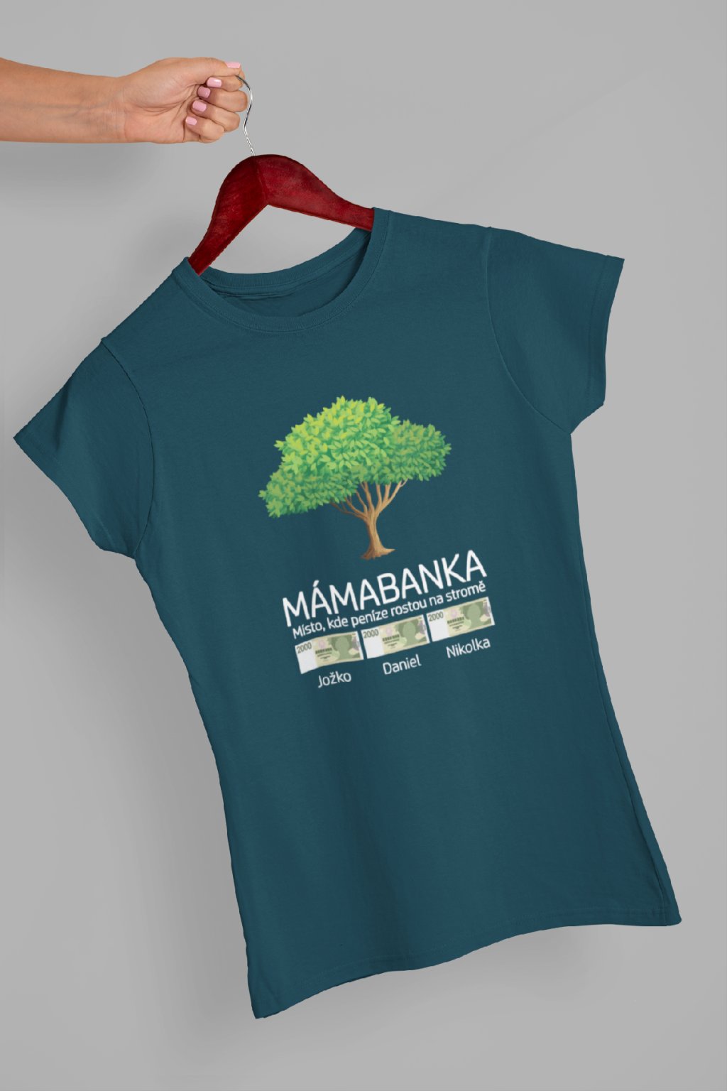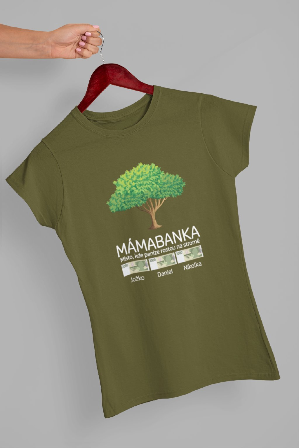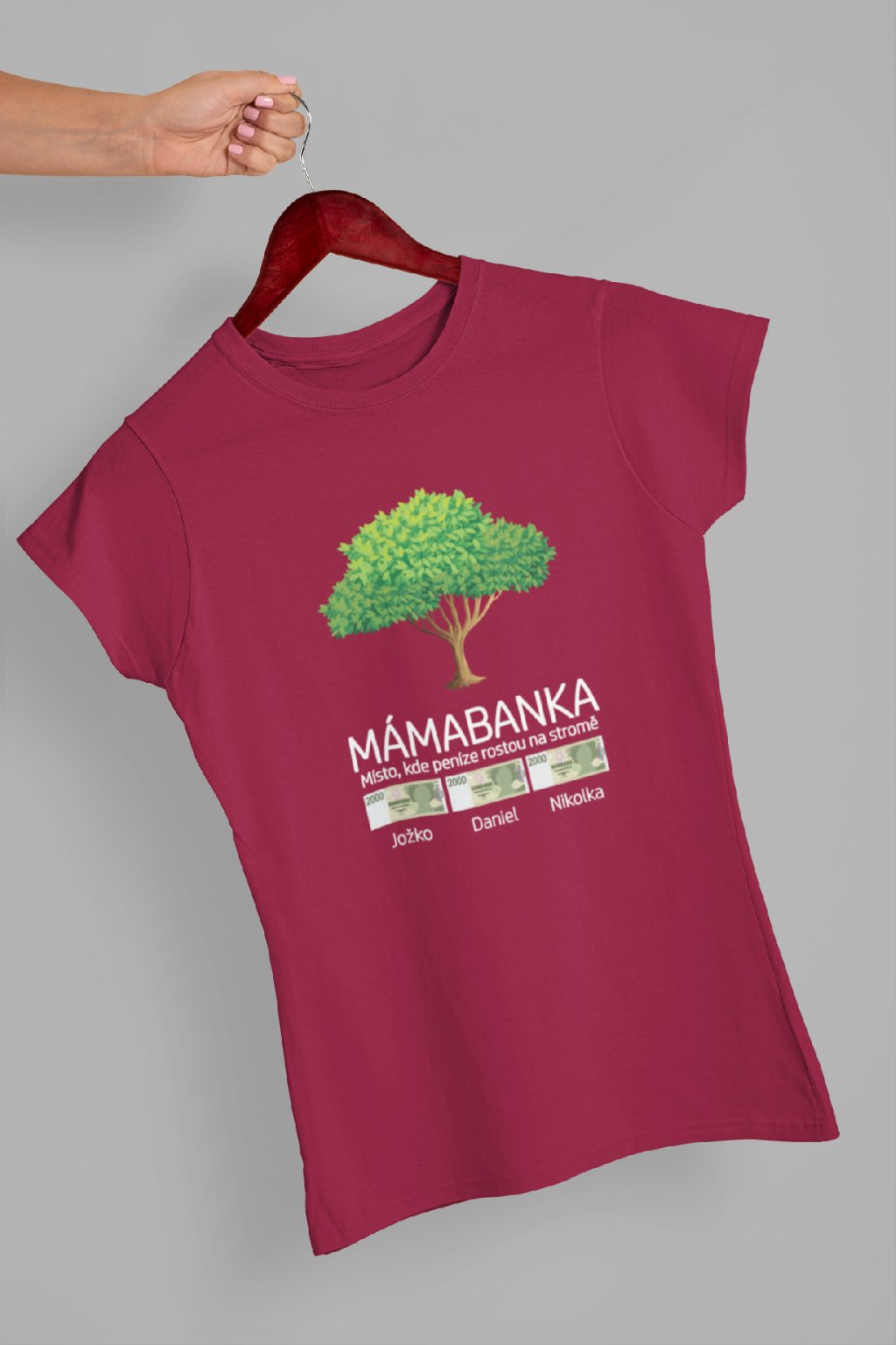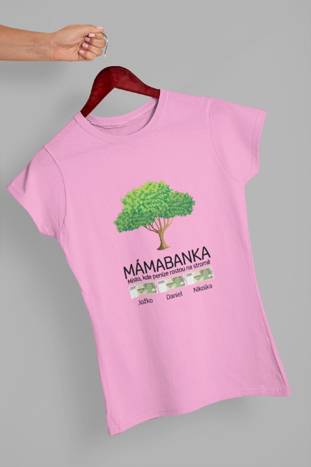 Dámské bavlněné triko s krátkým rukávem. Na tričku je nápis "Mámabanka". Pod nápisem je obrázek dětí spolu se jmény. Jména dětí si můžete doplnit podle sebe, stačí je jen napsat do poznámky k produktu.