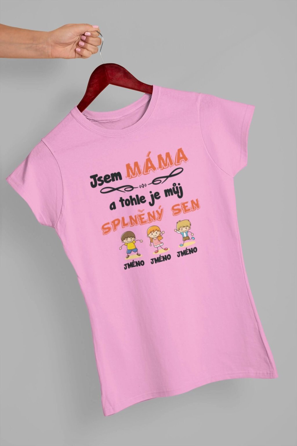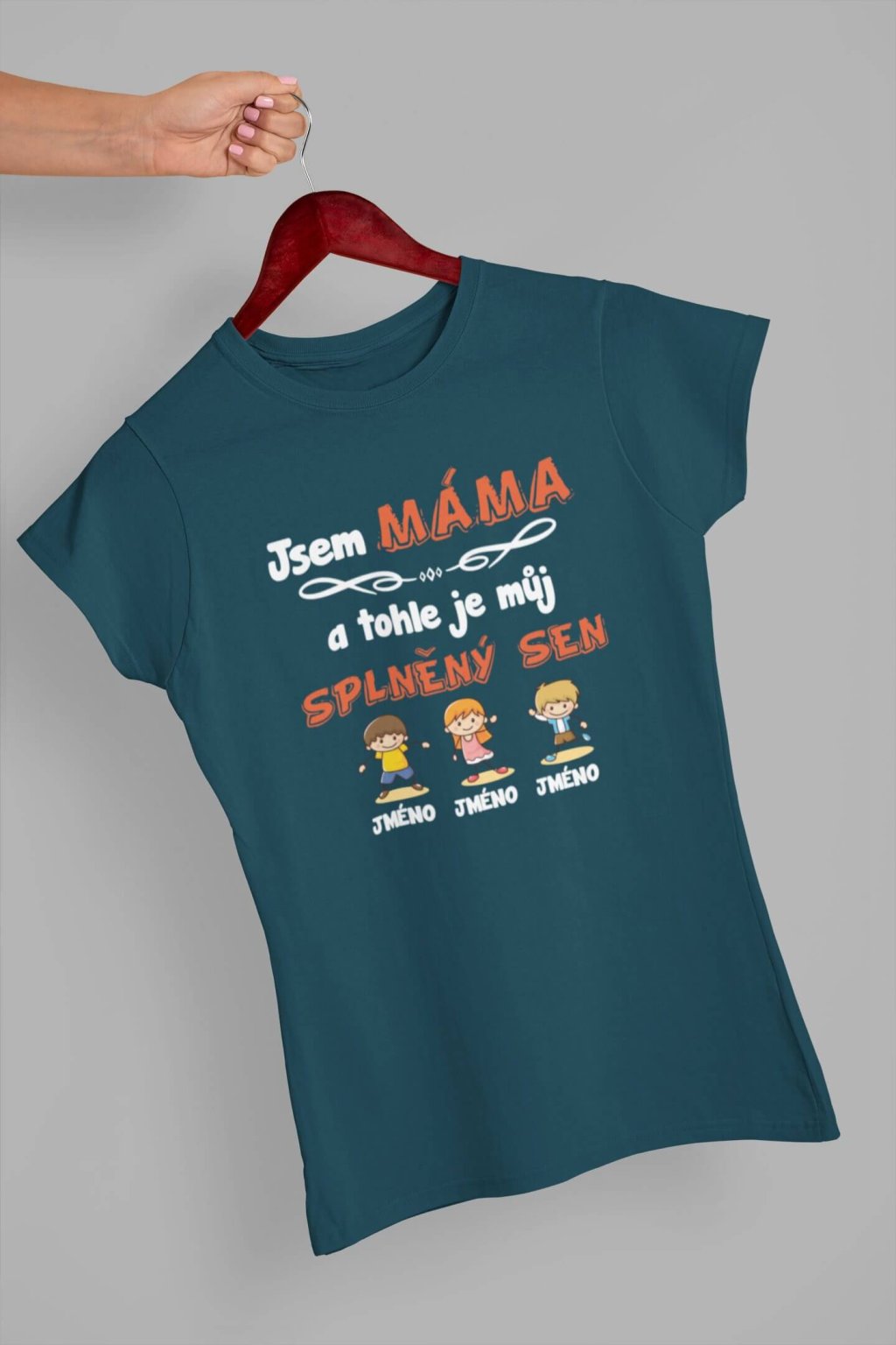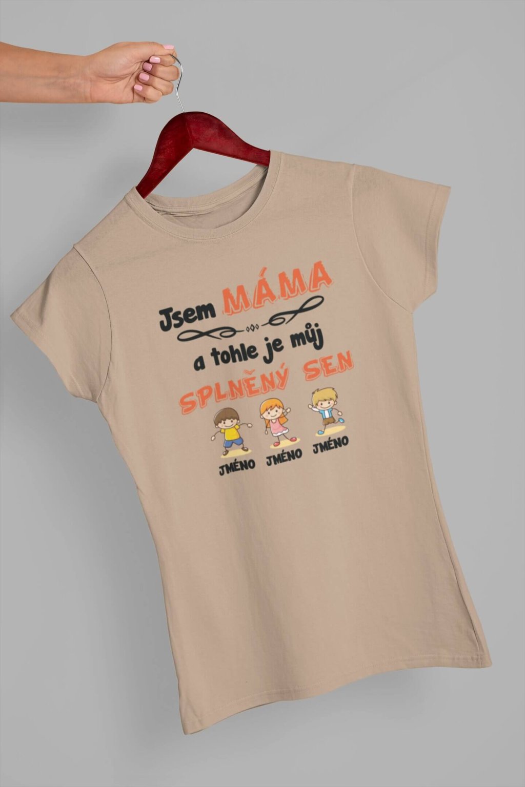 Dámské bavlněné triko s krátkým rukávem. Na tričku je nápis "Jsem MÁMA a tohle je můj splněný sen". Pod nápisem je obrázek dětí spolu se jmény. Jména dětí si můžete doplnit podle sebe, stačí je jen napsat do poznámky k produktu. Tričko lze přizpůsobit podle vašich požadavků. Stačí do poznámky napsat jména postaviček (chlapců a dívek), případně barvu vlasů a naši grafici se o to postarají :-)
