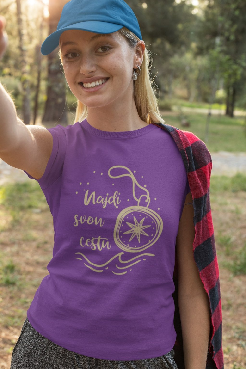 Dámské bavlněné tričko s krátkým rukávem a turistickým potiskem. Na tričku je obrázek s motivem přírody a kompas, vedle kterého já nápis:,, Najdi svou cestu. "