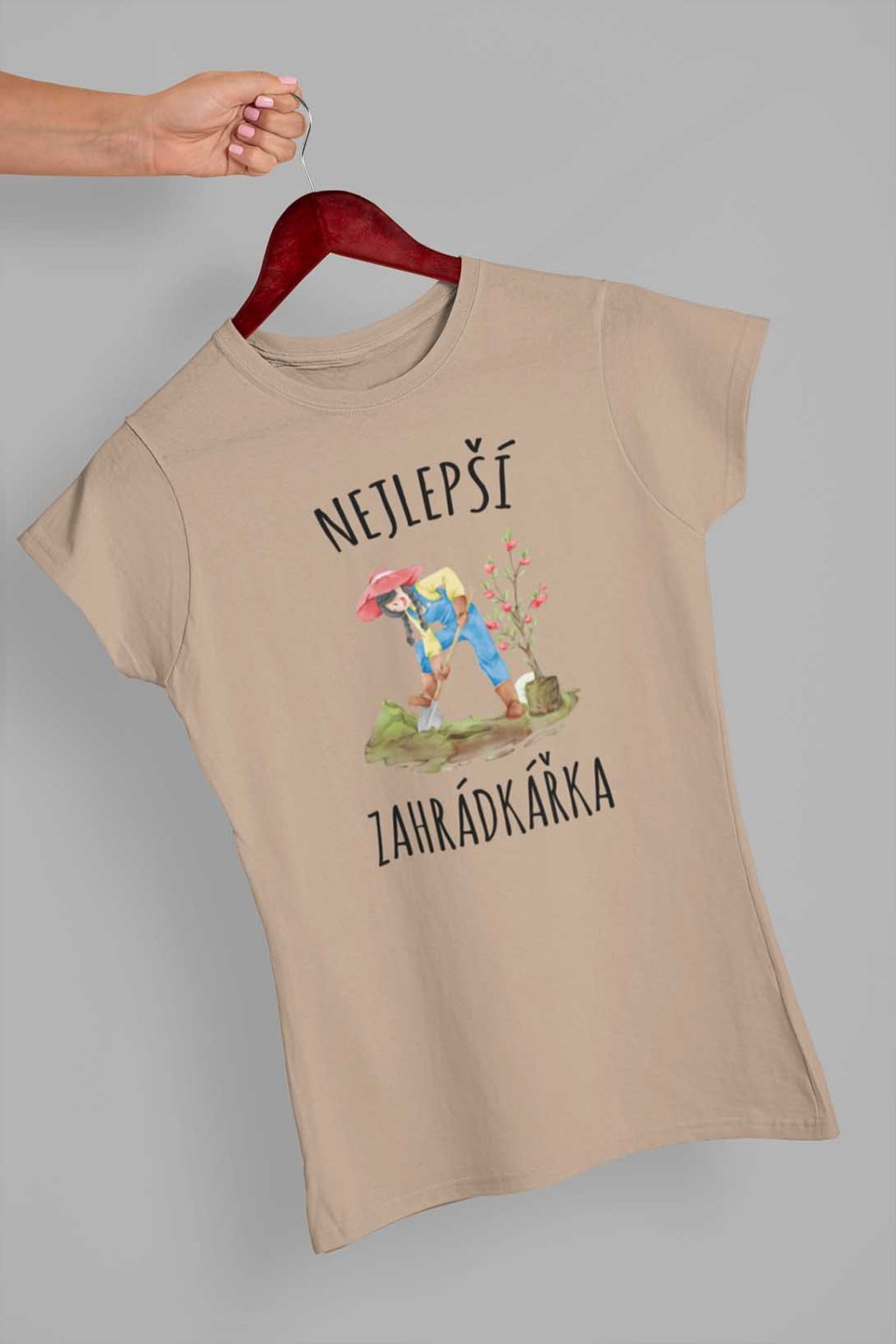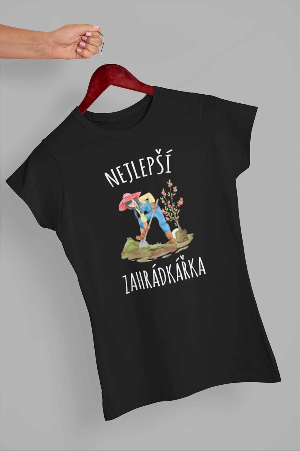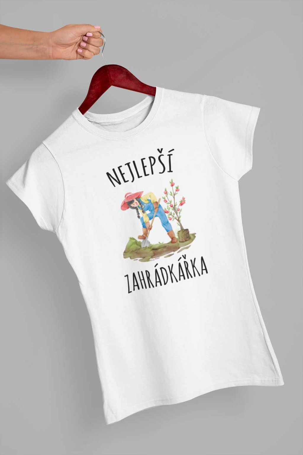 Dámské bavlněné triko s krátkým rukávem. Na tričku je nápis "Nejlepší zahrádkářka". Pod nápisem je obrázek zahrádkářky.