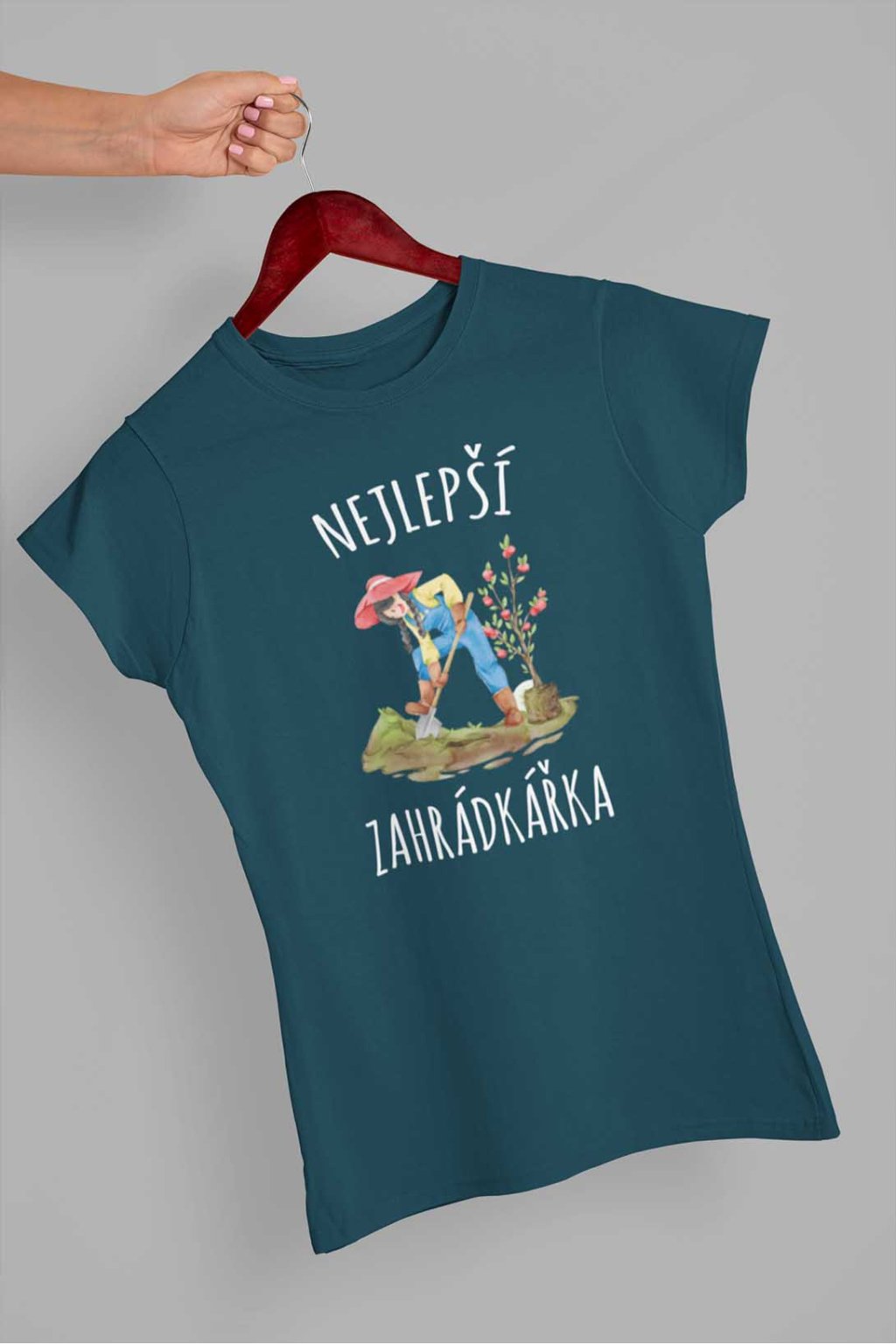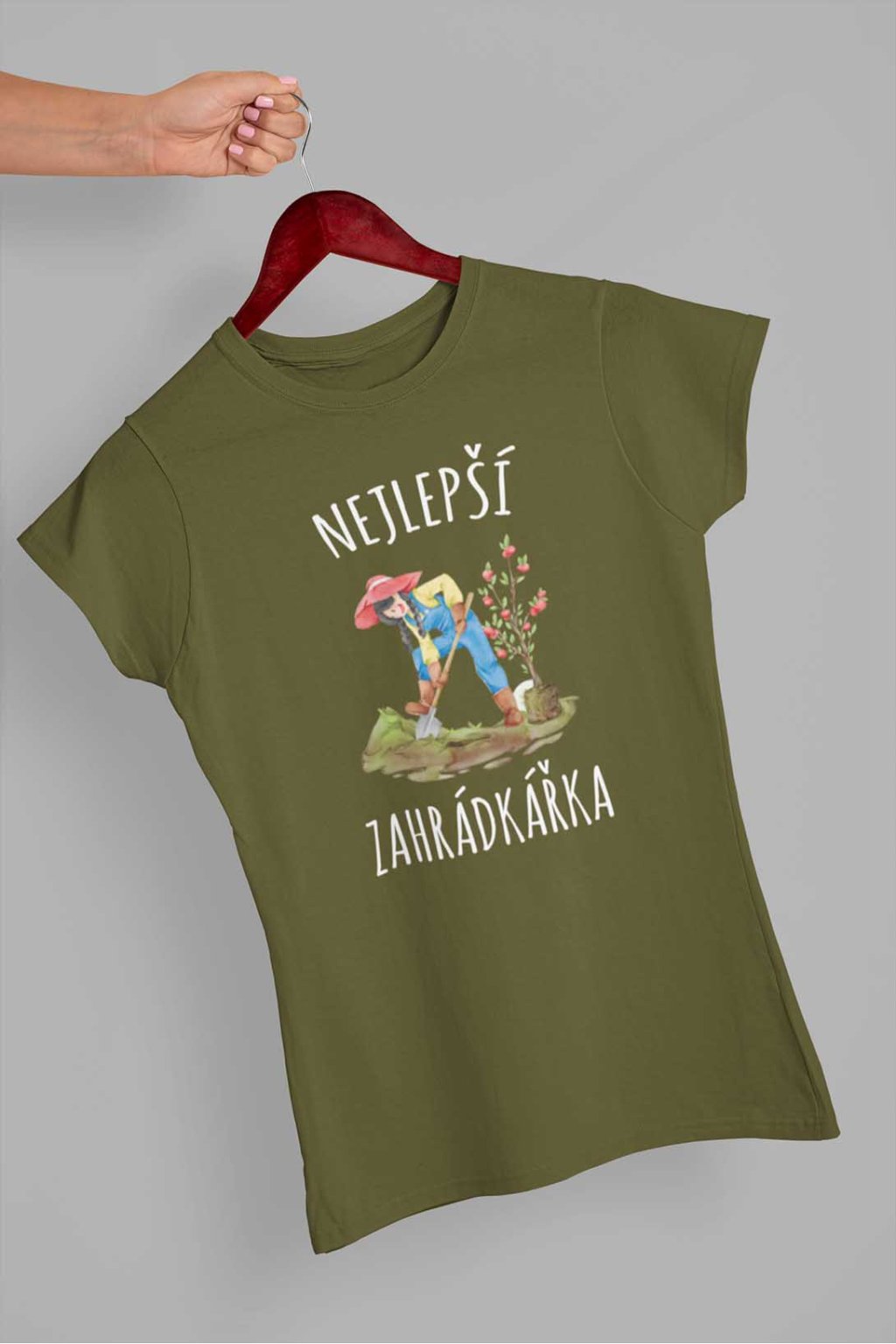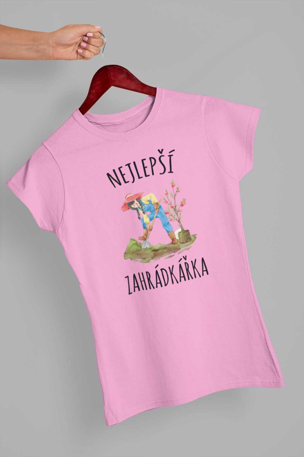Dámské bavlněné triko s krátkým rukávem. Na tričku je nápis "Nejlepší zahrádkářka". Pod nápisem je obrázek zahrádkářky.