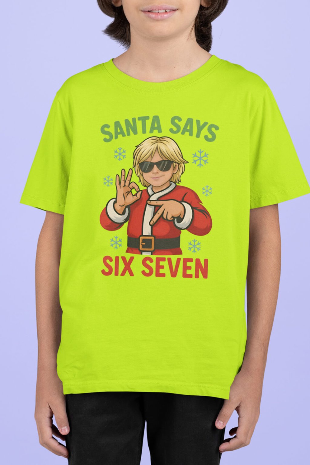 Veselé a originální dětské triko, které okamžitě přitáhne pozornost! Na přední straně se nachází stylová kreslená postavička v Santa oblečení, která ukazuje rukama gesto „6 – 7“. Design doplňují sněhové vločky, nápis Santa Says Six Seven.
