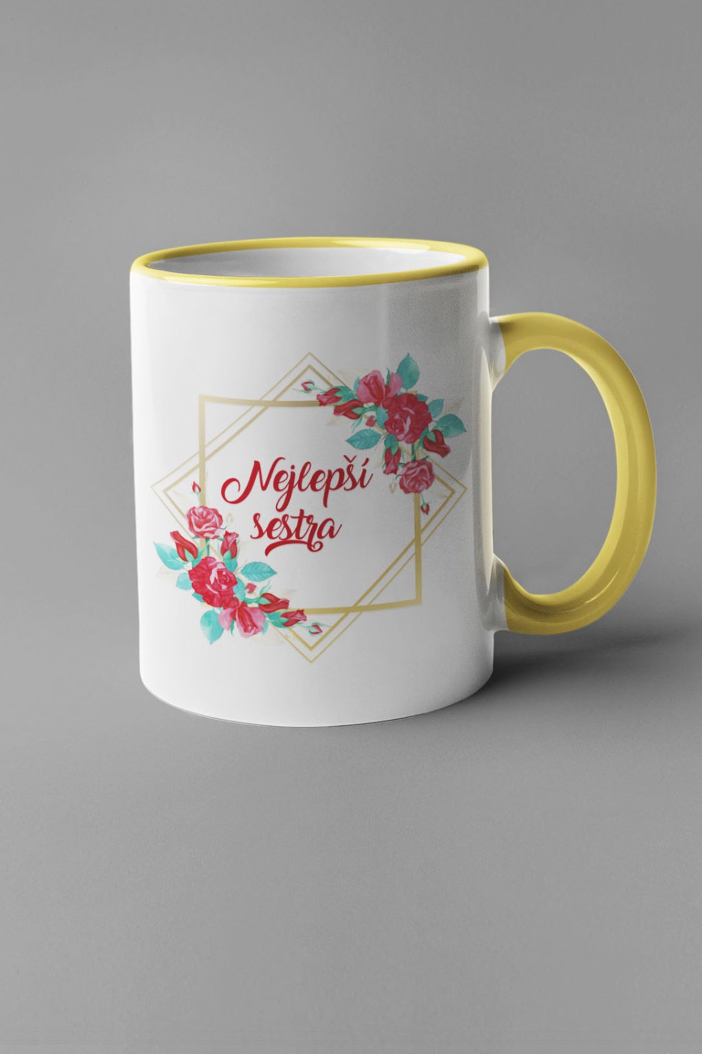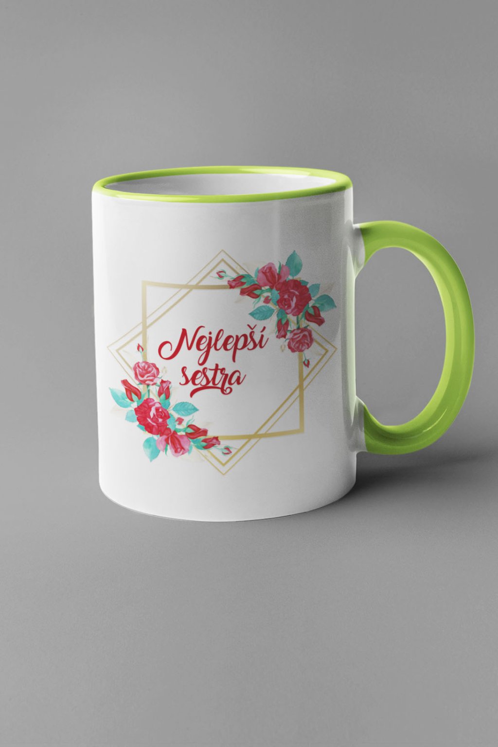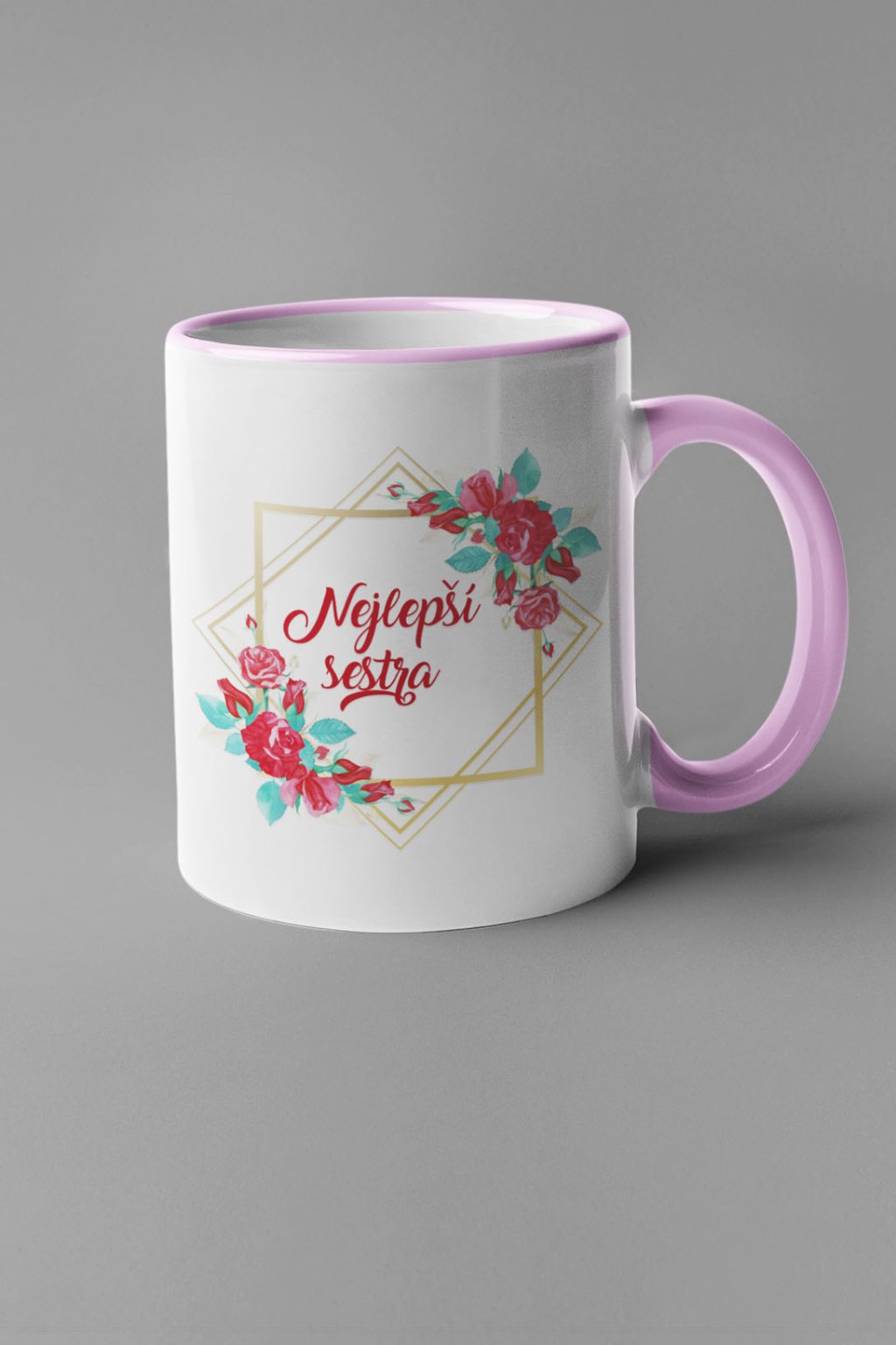 Bílý keramický hrnek, na kterém je obrázek květin s nápisem: ,,Nejlepší sestra."