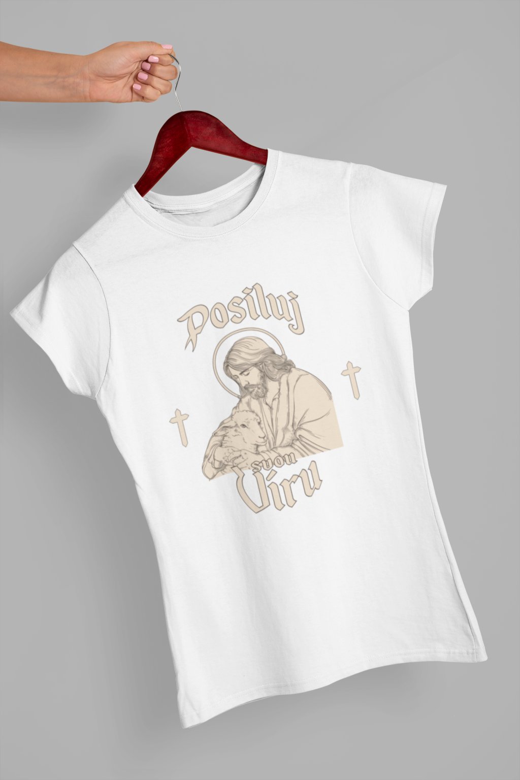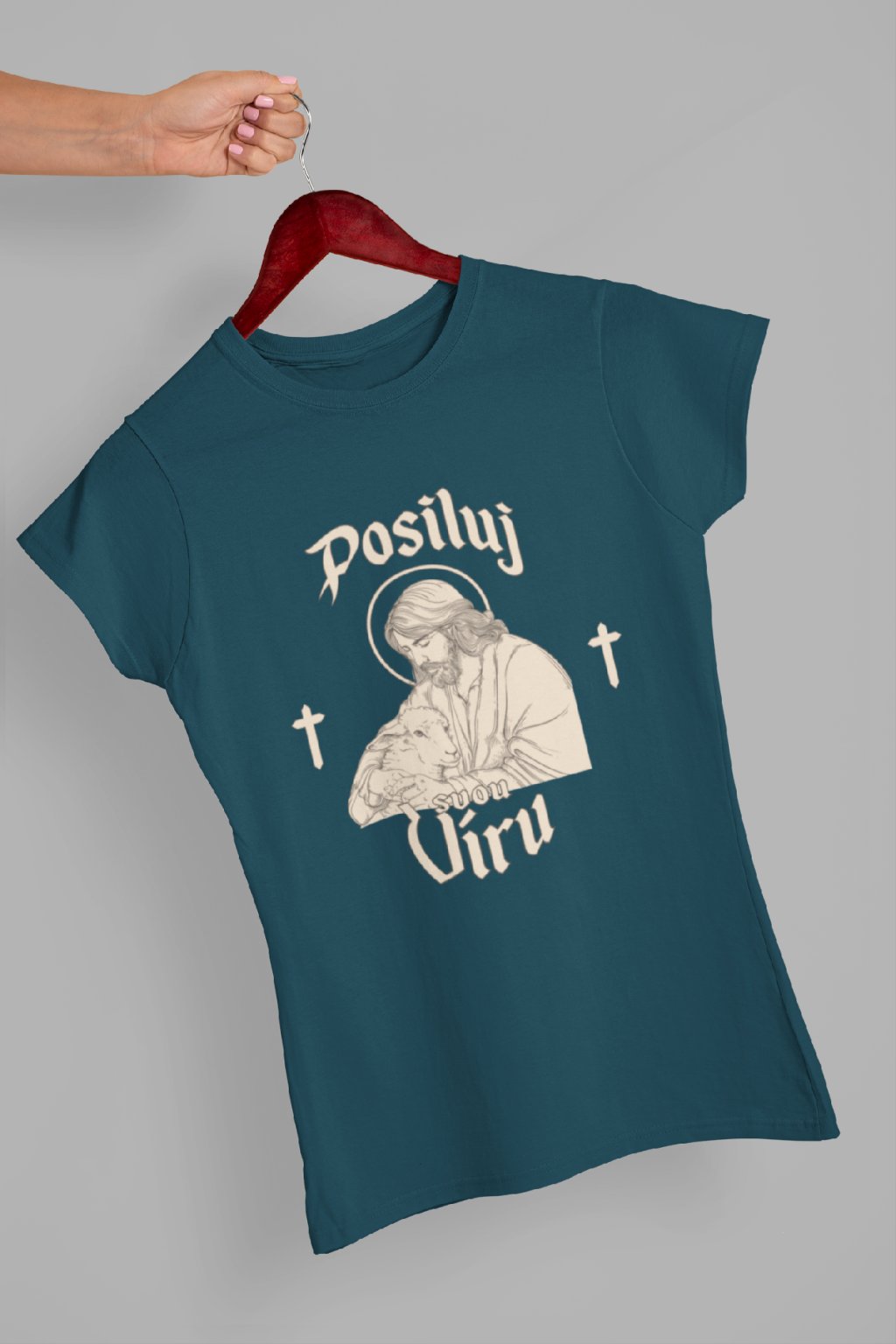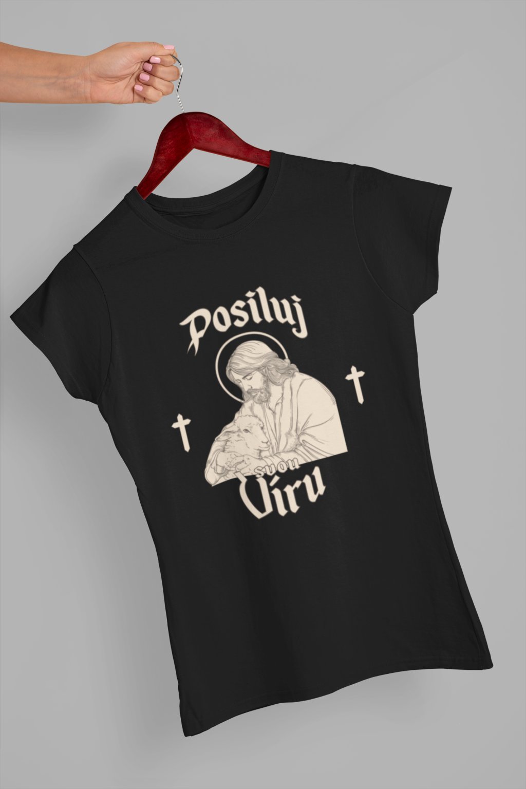 Křesťanské bavlněné tričko s obrázkem Ježíše a nápisem „Posiluj svou víru“.