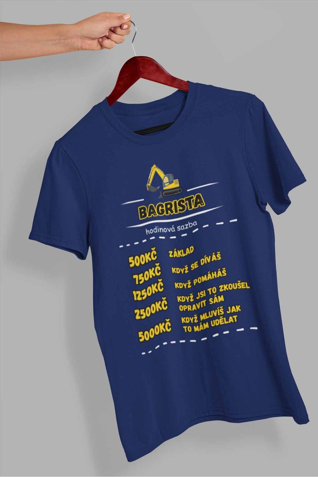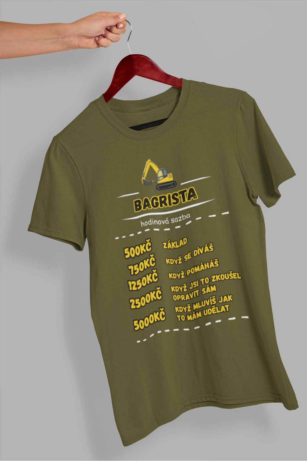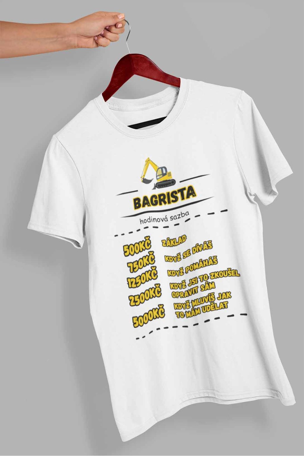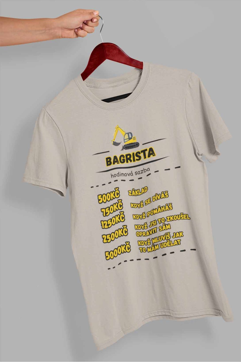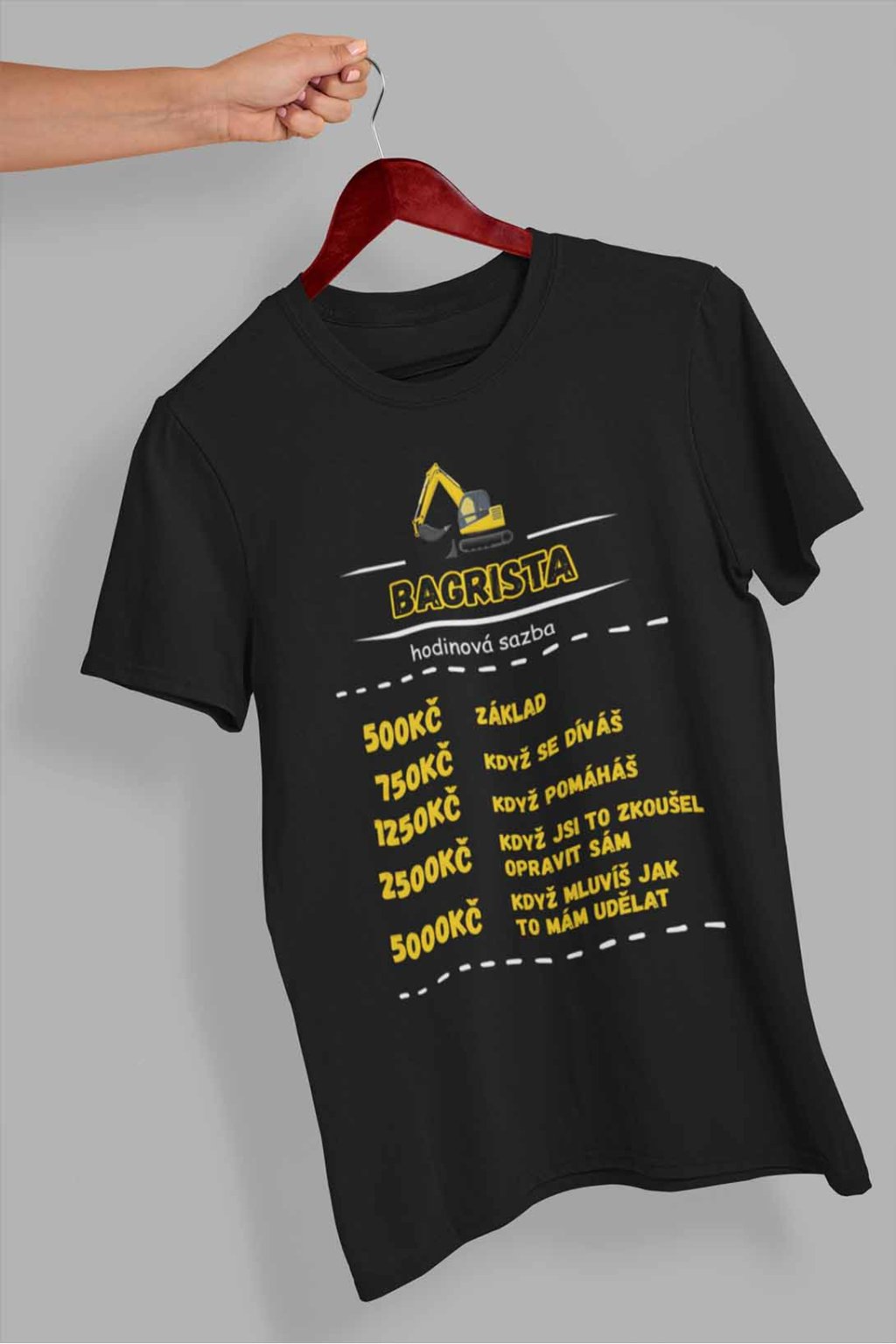 Pánské bavlněné triko s krátkým rukávem a vtipným nápisem. Na tričku je nápis "Pánské tričko Bagrista" a vtipná cenová nabídka.