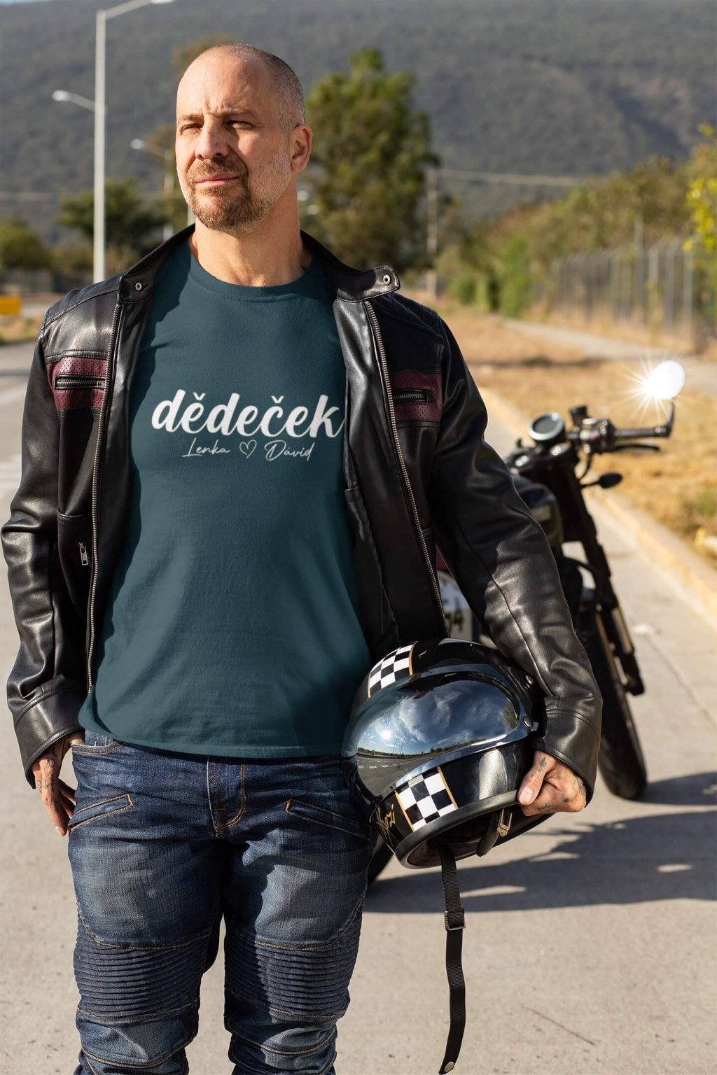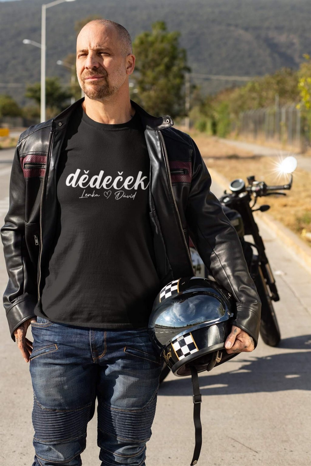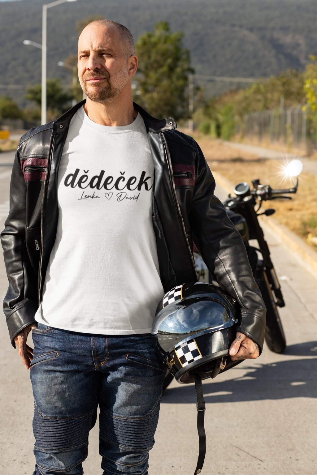 Pánské bavlněné triko pro každého dědu. Na triku je nápis "dědeček" a pod ním jména dětí. Jména dětí napište do poznámky k produktu!