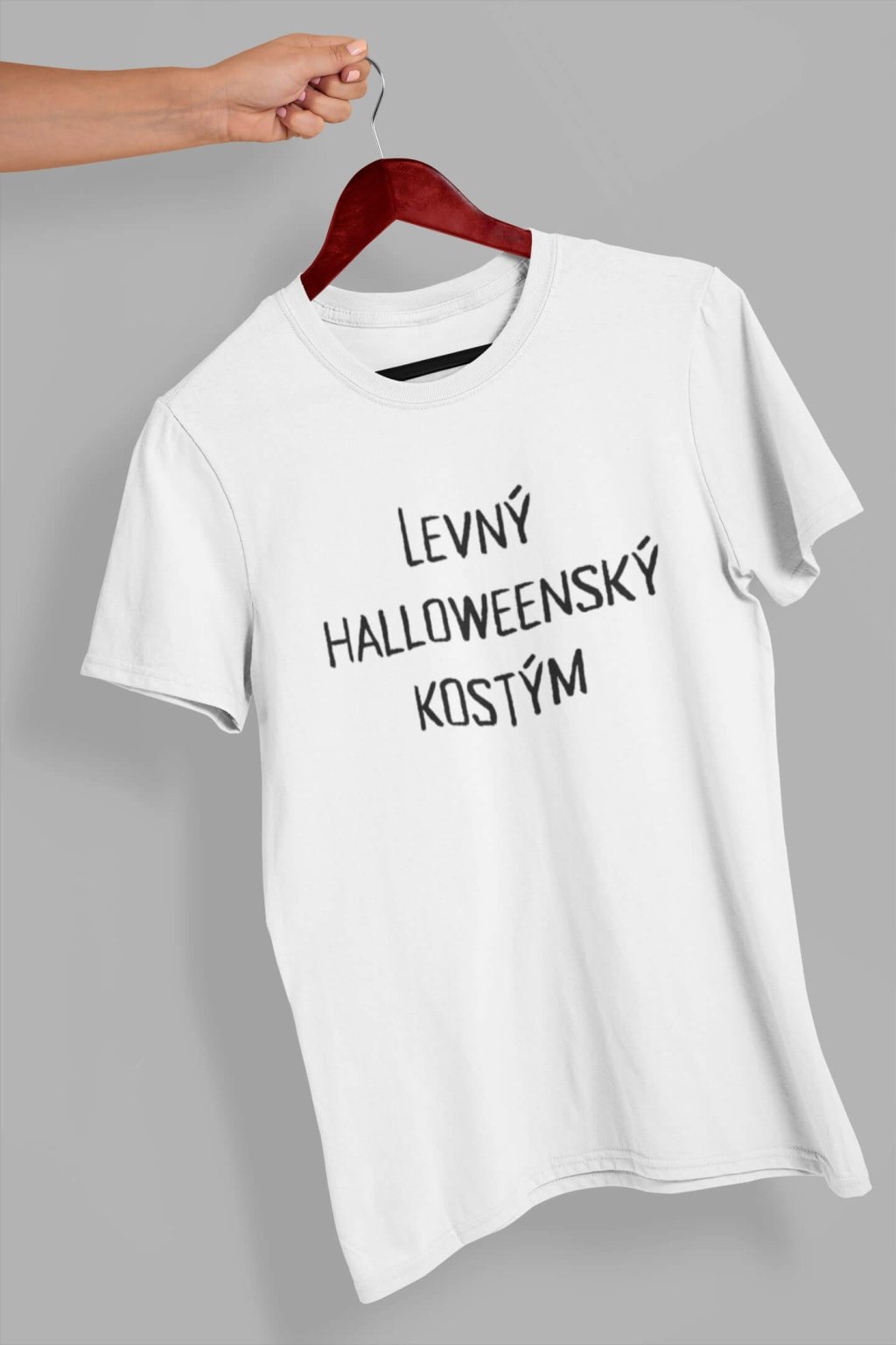 Pánské bavlněné triko s krátkým rukávem a vtipným potiskem. Na tričku je nápis "LEVNÝ HALLOWEENSKY KOSTÝM". Pokud si nechcete dělat starosti s kostýmem, toto triko je ideální pro Vás.