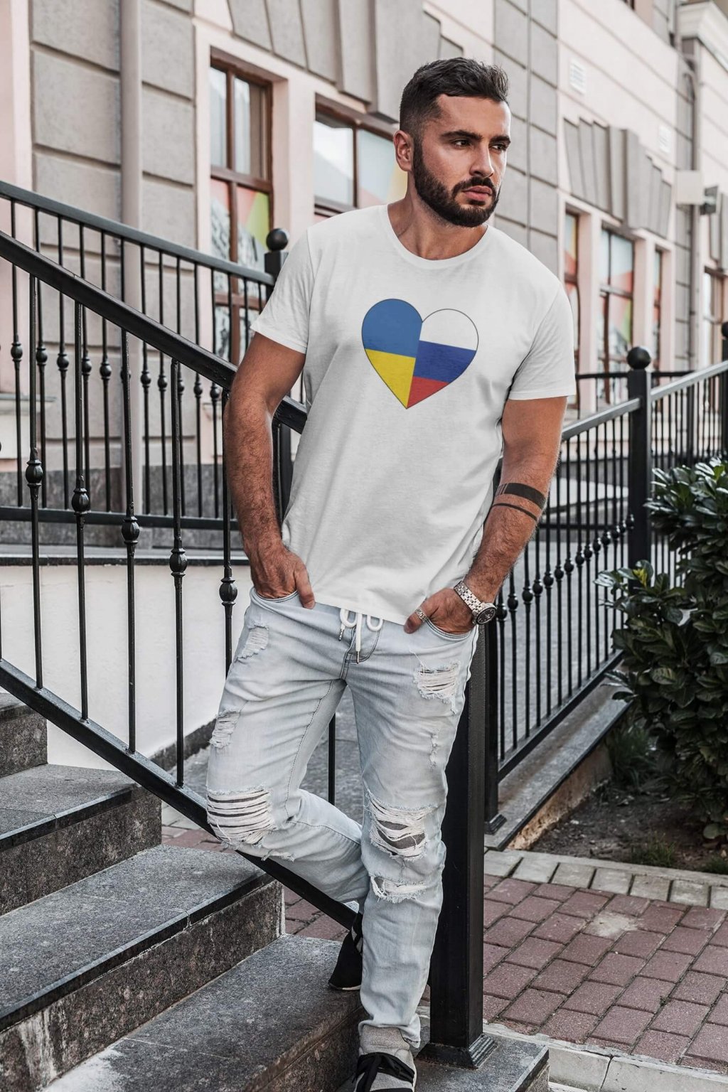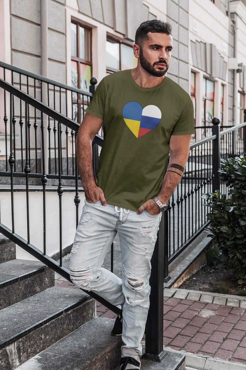 Pánské bavlněné triko s krátkým rukávem, na kterém je obrázek srdce a v něm dvě vlajky států.