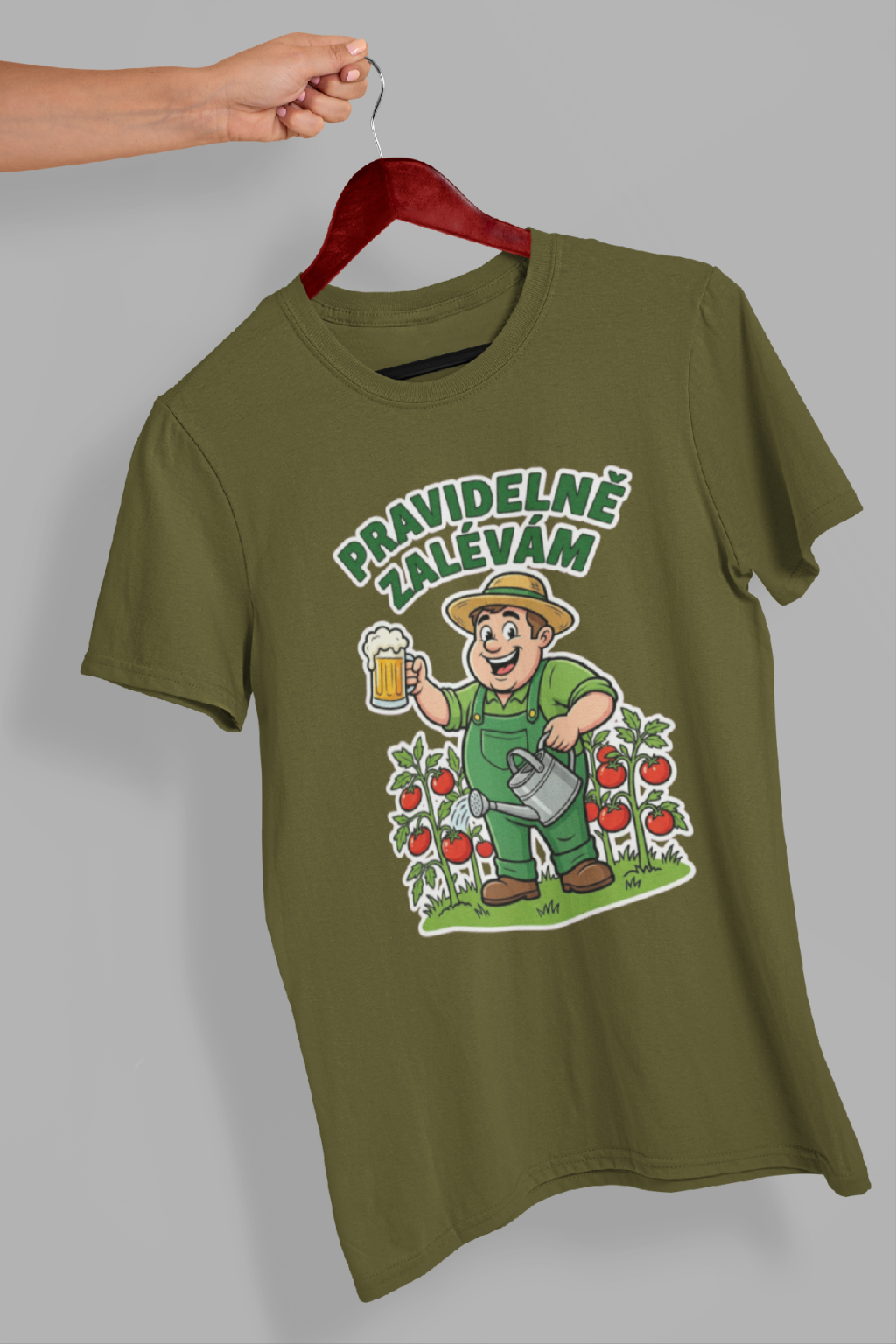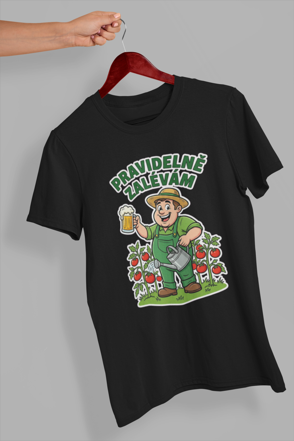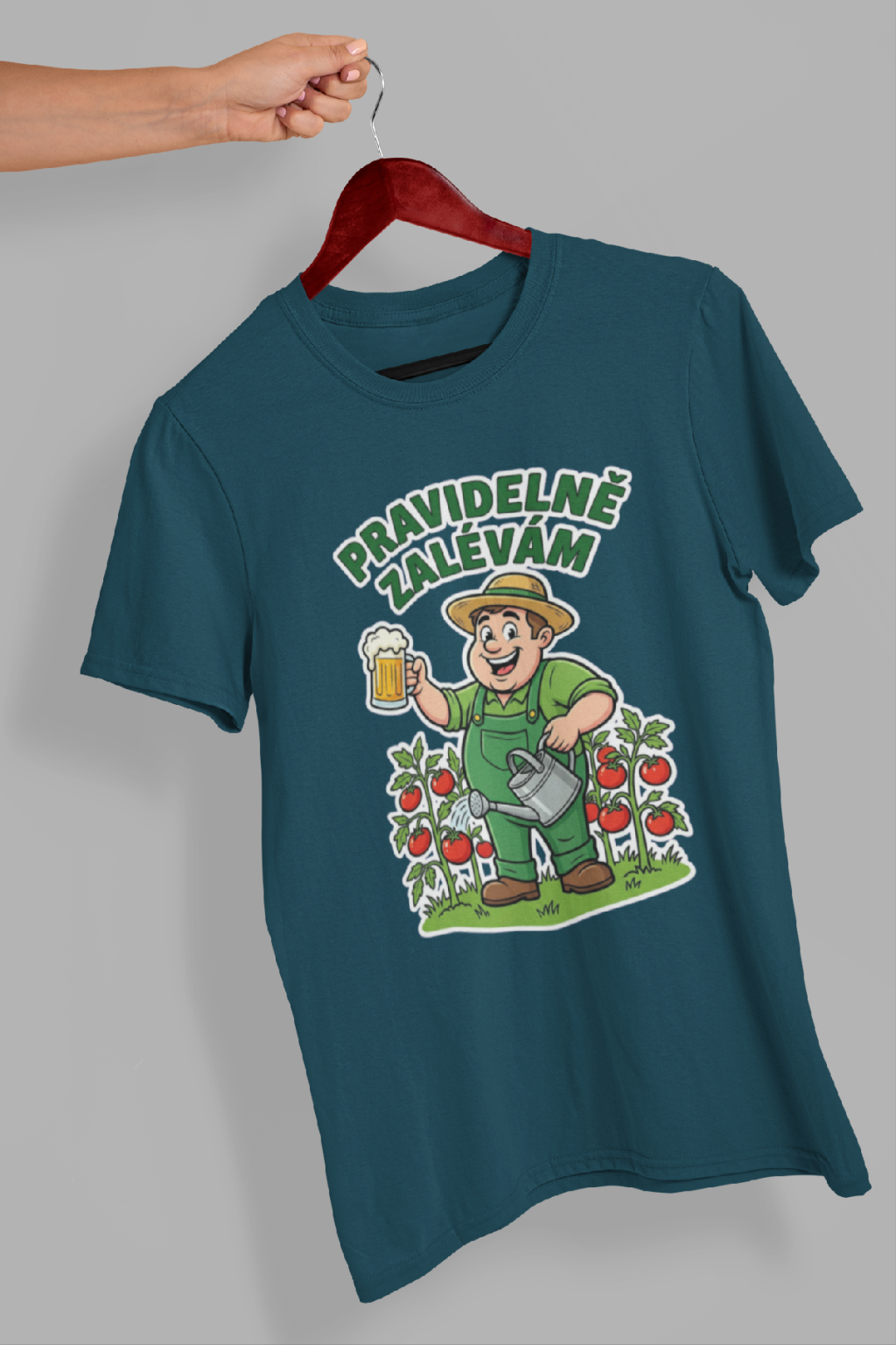 Pánské bavlněné tričko s krátkým rukávem as nápisem pro milovníky zahrádky. Na tričku je nápis: ,,pravidelně zalévám". Nápis je vhodný pro muže, kteří milují práci na slunci.