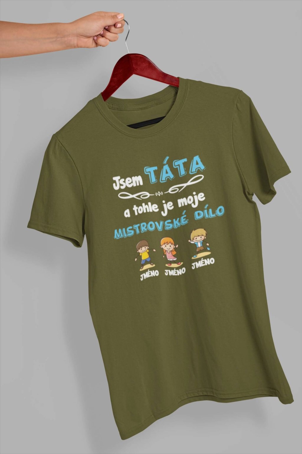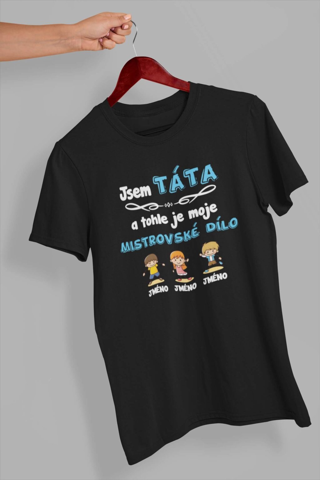 Pánské bavlněné triko s krátkým rukávem. Na tričku je nápis "Jsem TÁTA a tohle je moje mistrovské dílo". Pod nápisem je obrázek dětí spolu se jmény. Jména dětí si můžete doplnit podle sebe, stačí je jen napsat do poznámky k produktu. Tričko lze přizpůsobit podle vašich požadavků. Stačí do poznámky napsat jména postaviček (chlapců a dívek), případně barvu vlasů a naši grafici se o to postarají :-)