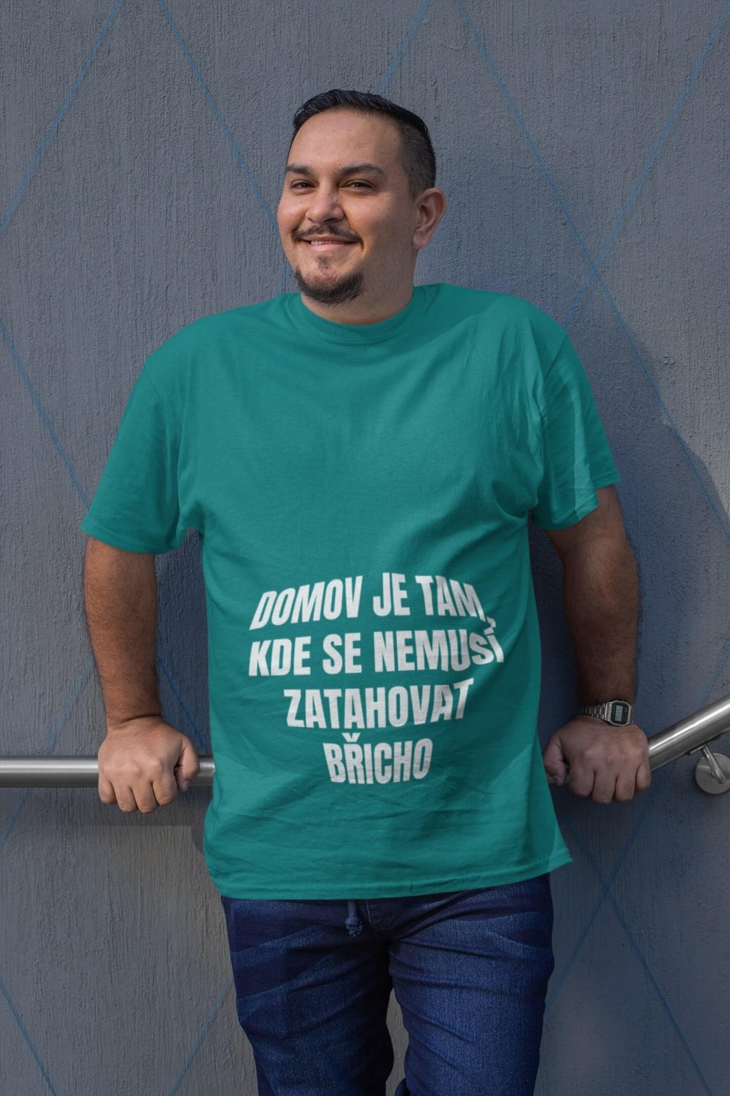 Pánské bavlněné tričko s krátkým rukávem a originálním potiskem. Na tričku je nápis:,, DOMOV JE TAM, KDE SE NEMUSÍ ZATAHOVAT BŘICHO."