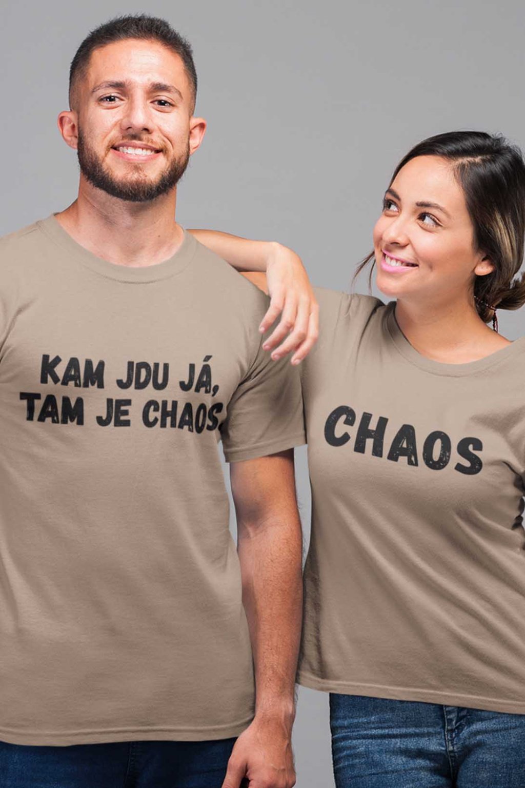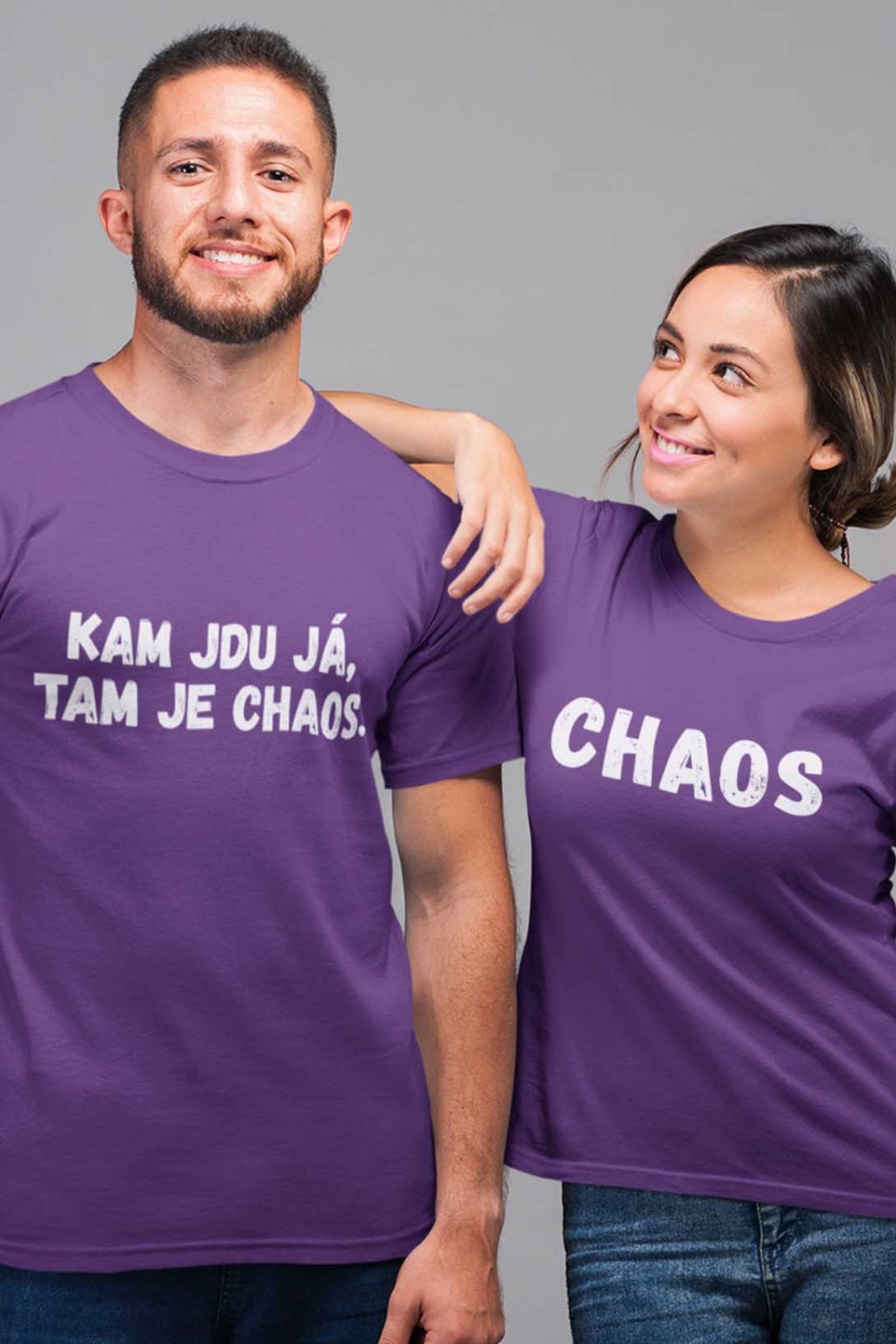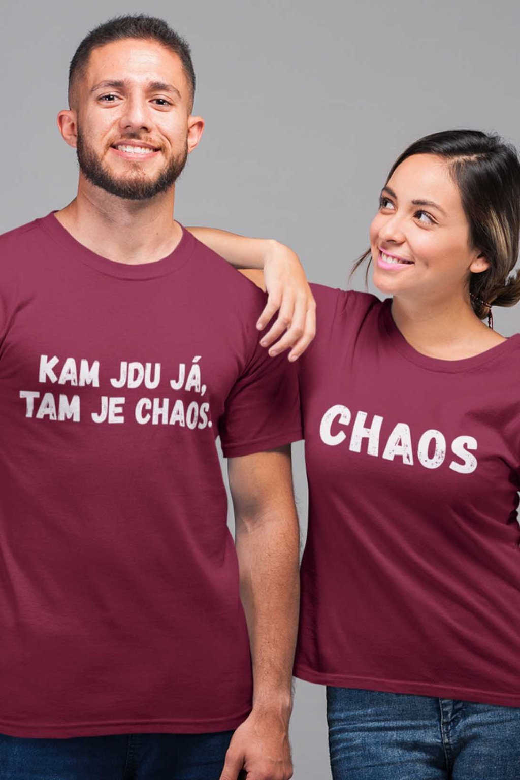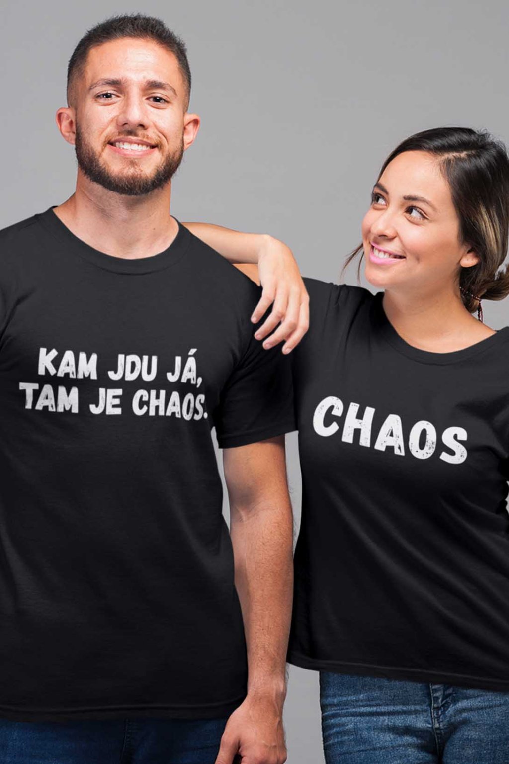 Bavlněná trička pro páry na téma Dudu a Bubu. Na pánském tričku je nápis: „Kám jdu já, tam je chaos." Ženy mají nápis: „CHAOS" Trička, která se vzájemně doplňují potěší všechny páry.