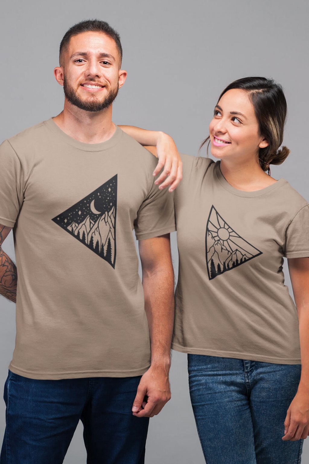 Bavlněná trička pro páry s turistickým potiskem. Na pánském tričku je obrázek s tématem noci. Ženy naopak mají obrázek s tématem den. Trička, která se vzájemně doplňují potěší všechny zamilované.