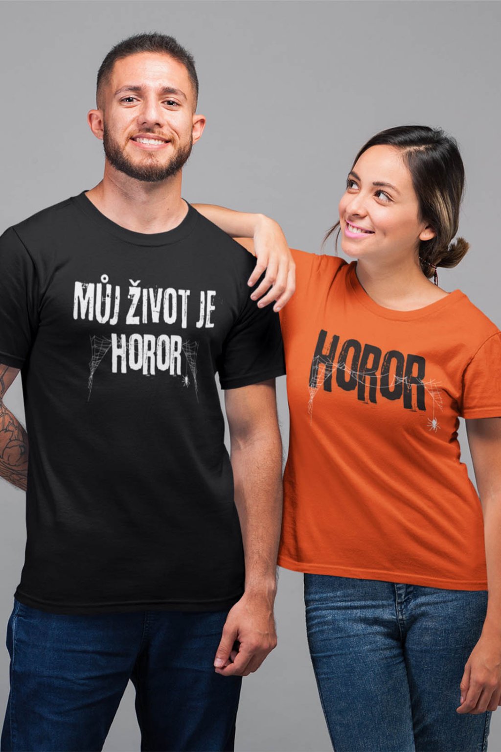 Tato originální párová trička s nápisy „Můj život je horor“ a „Horor“ jsou ideální pro dvojice, které si rádi dělají legraci ze života (i ze sebe navzájem).