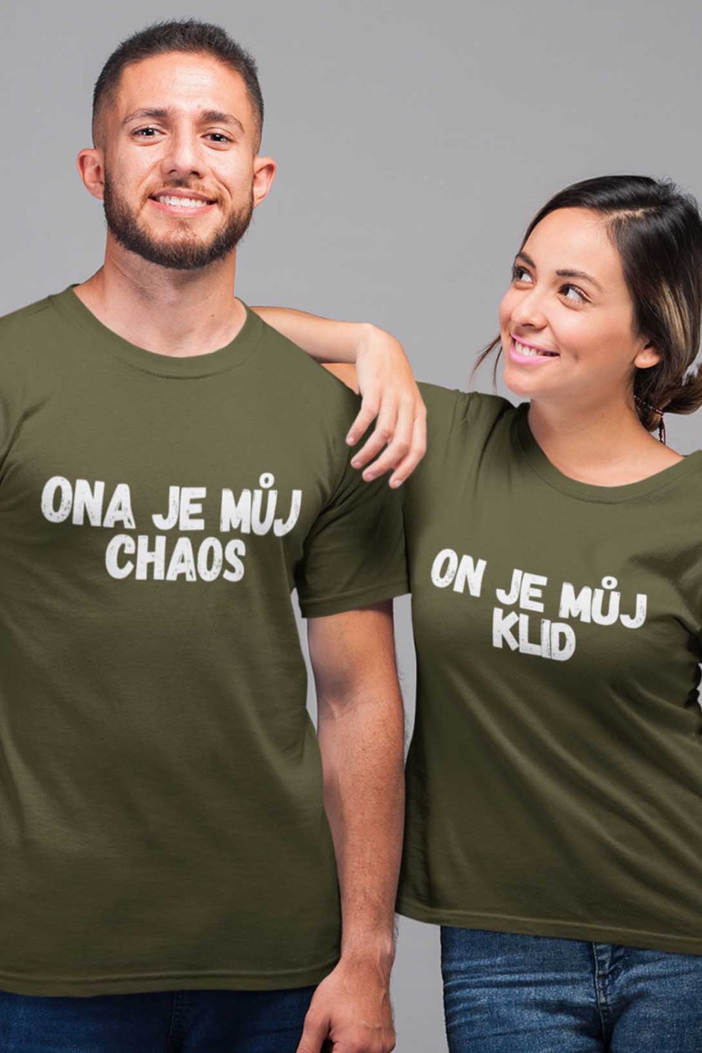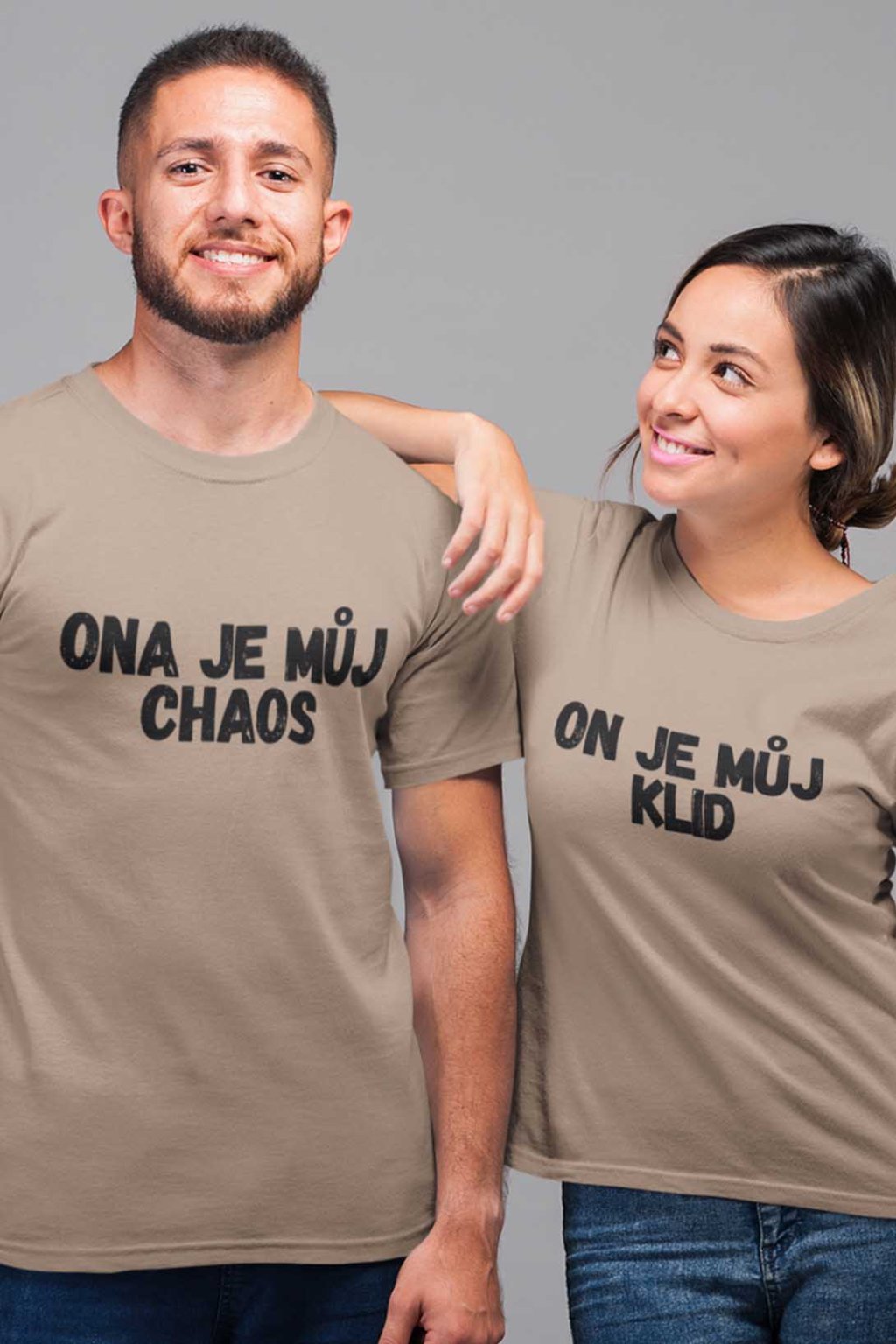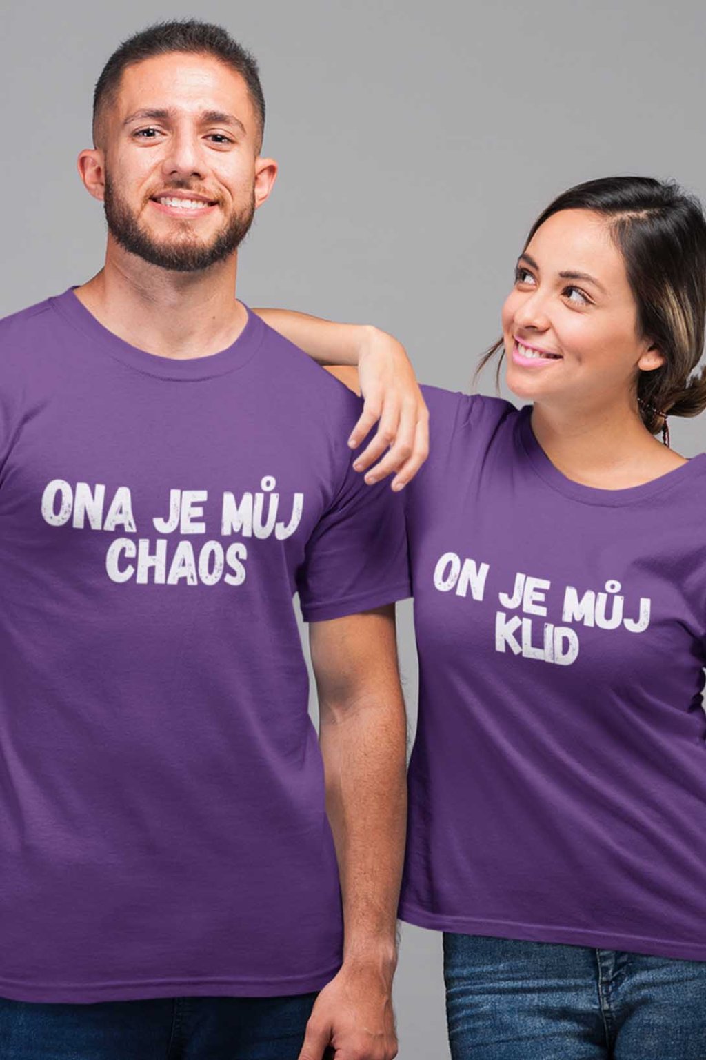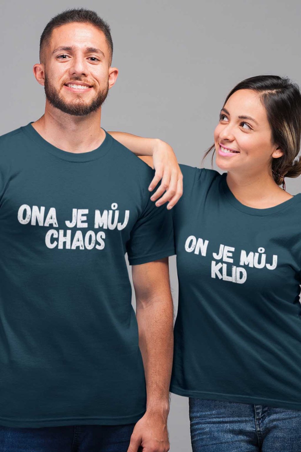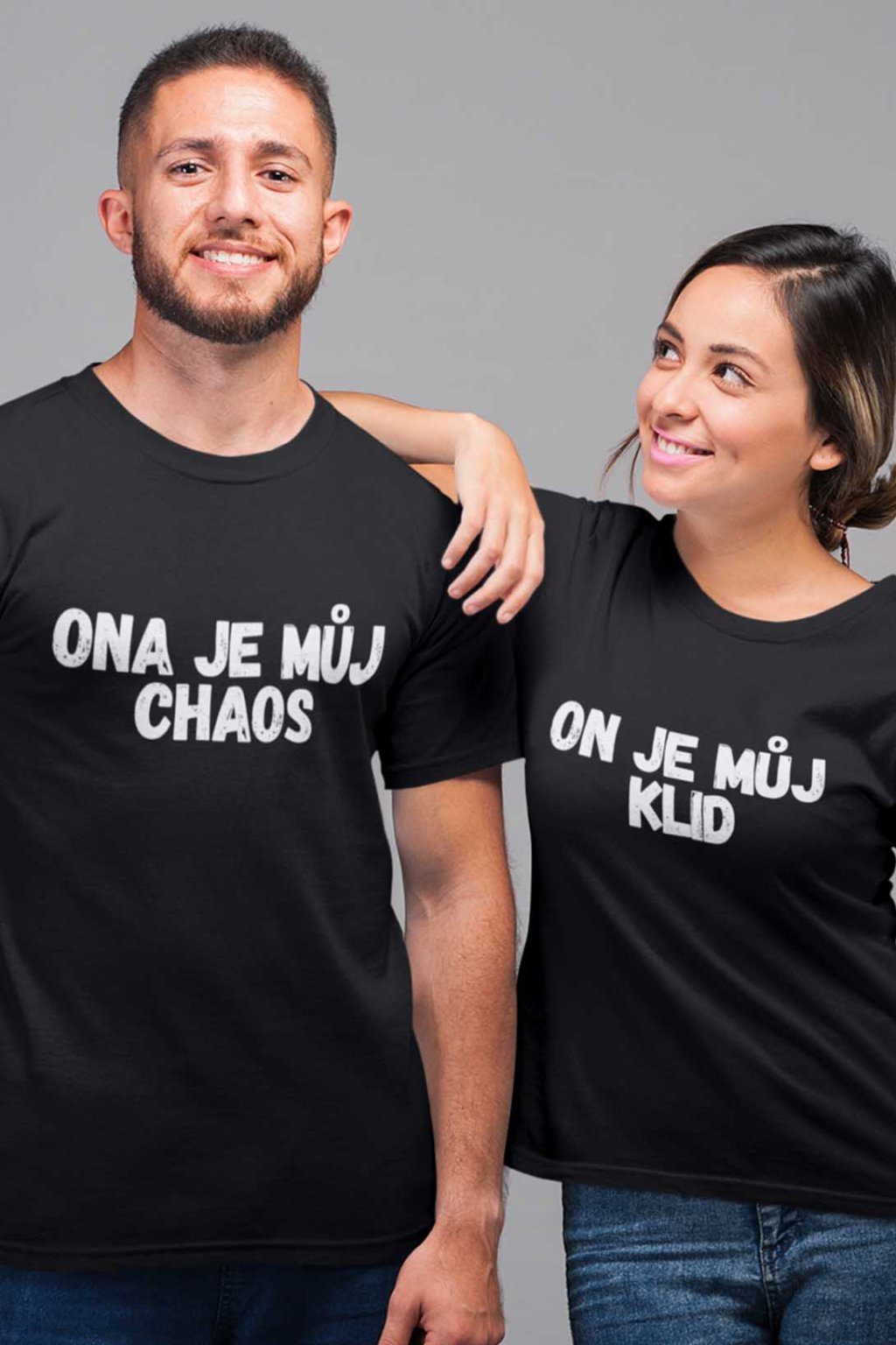 Bavlněná trička pro páry na téma Dudu a Bubu. Na pánském tričku je nápis: „Ona je můj chaos" Ženy mají nápis: „On je můj klid" Trička, která se vzájemně doplňují potěší všechny páry.